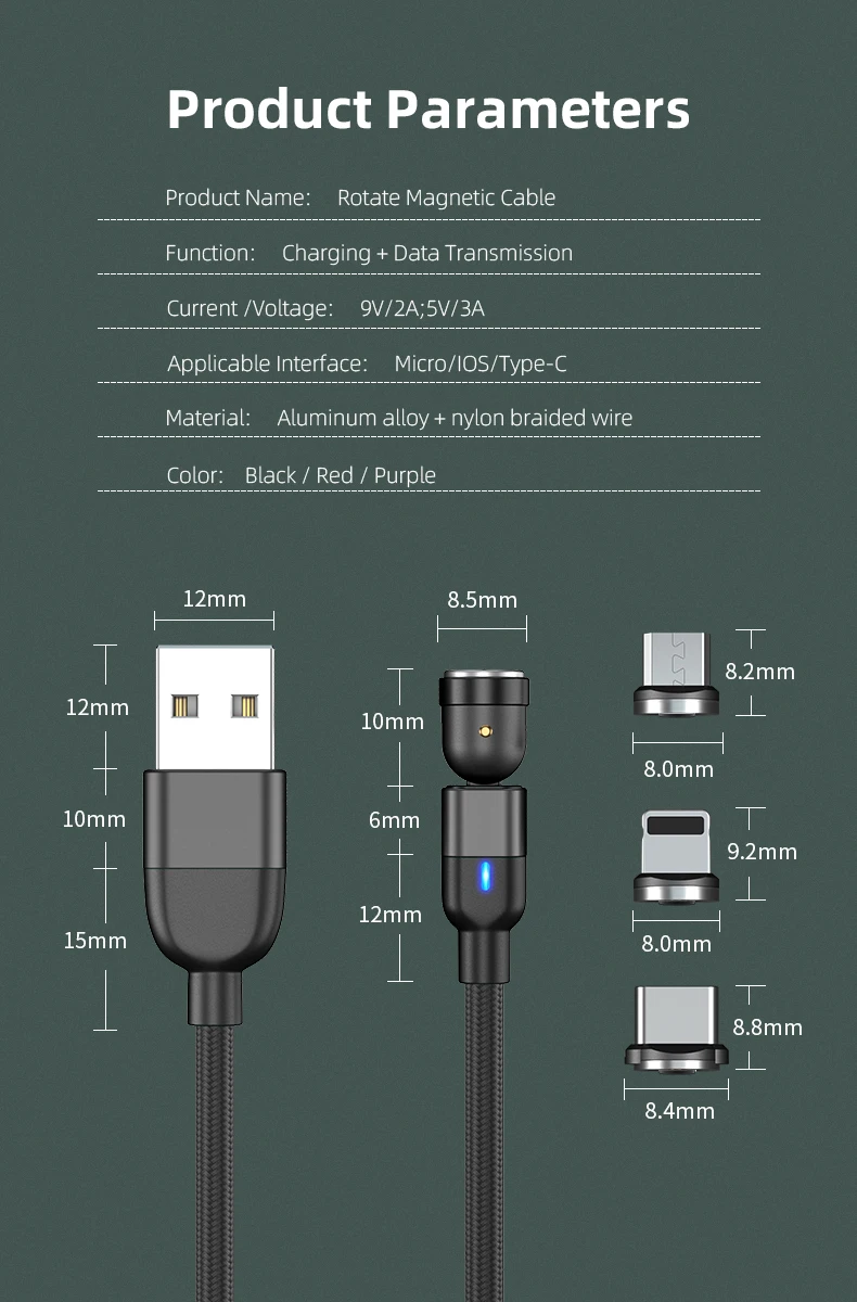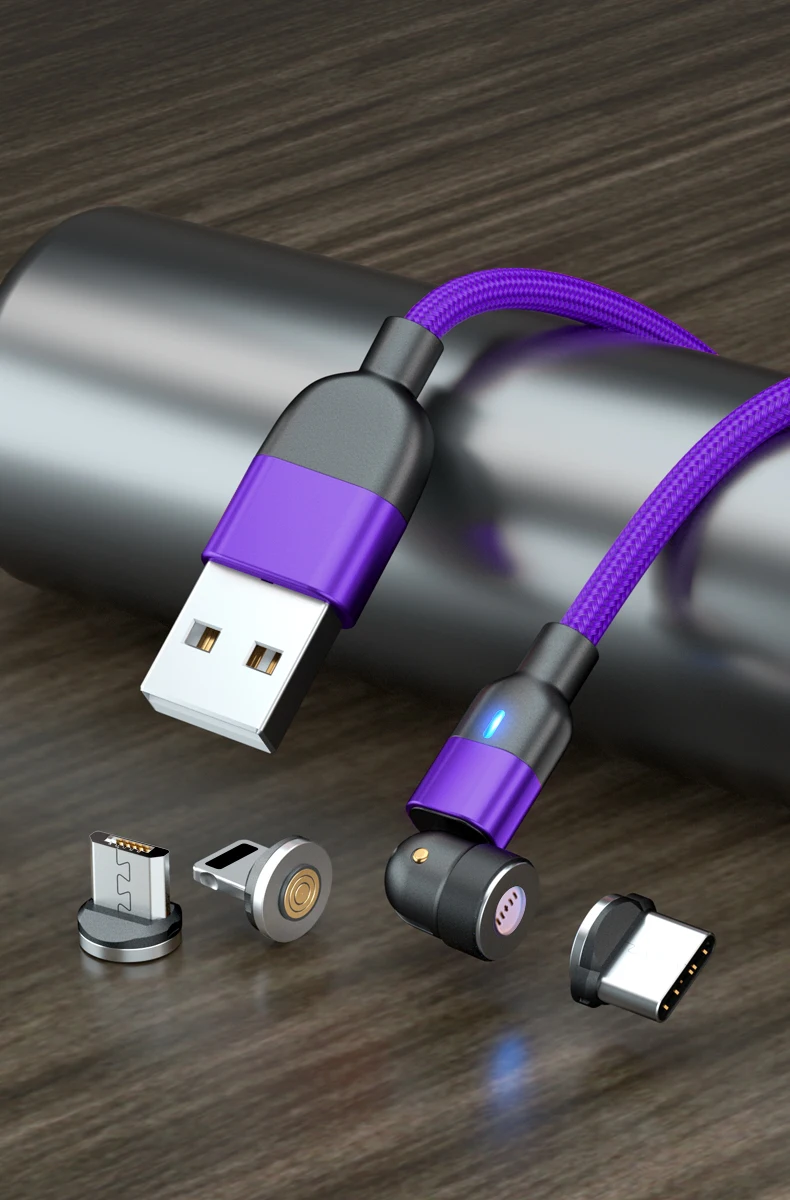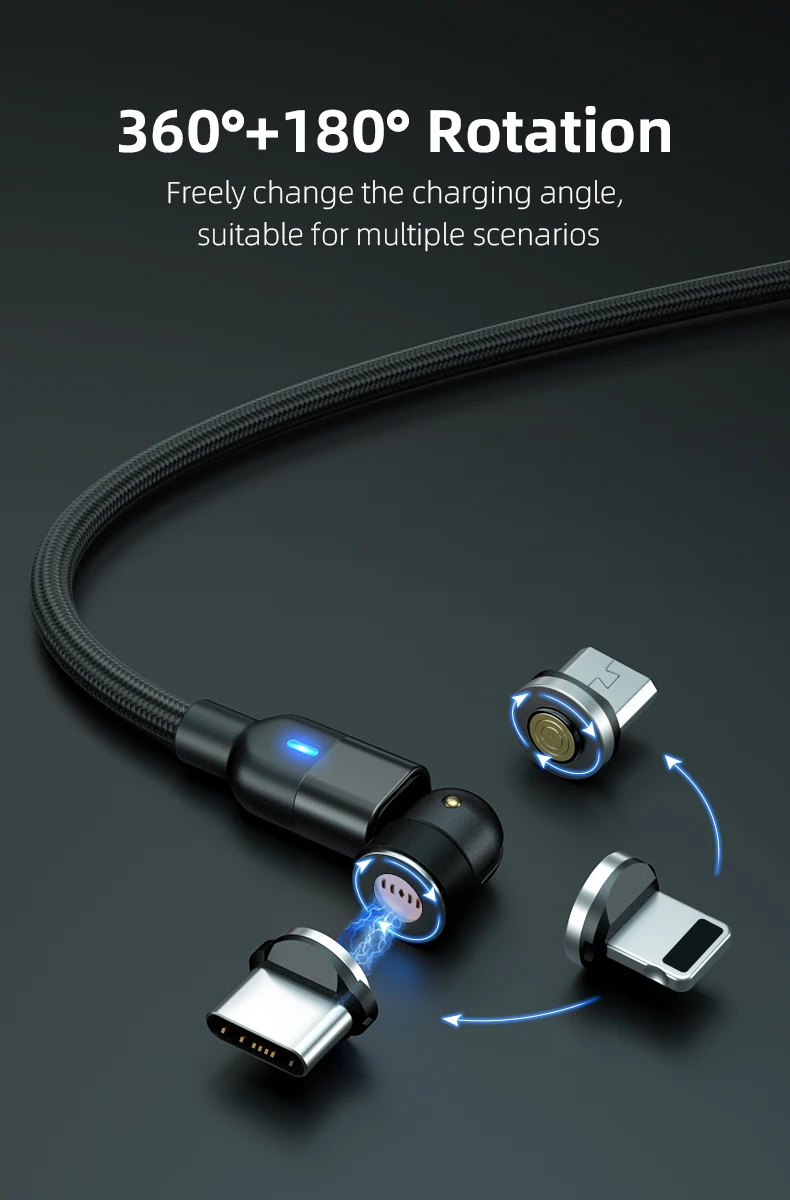 Магнитный кабель Micro USB C с поворотом на 360 градусов, светодиодный кабель для быстрой зарядки для iPhone 12, 11, Samsung, Xiaomi mi 9, 10, Redmi note 8, Huawei P30