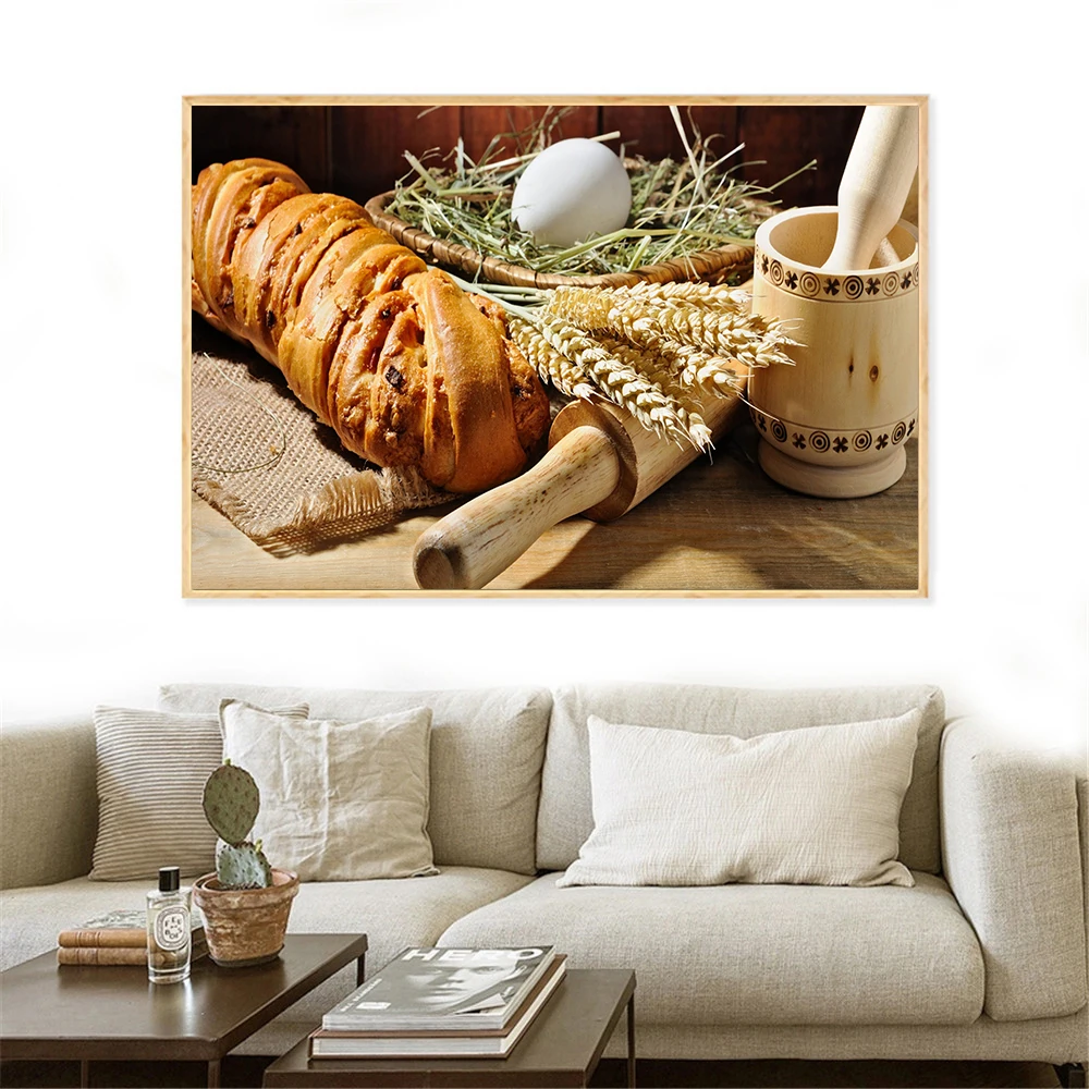Картина на холсте завтрака, кофе, хлеб, пшеница и яйцо в форме сердца