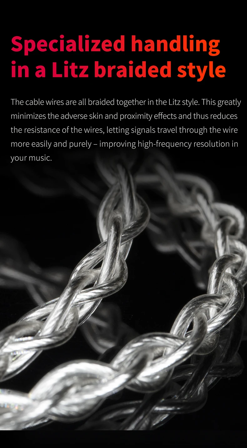 Чистый опыт работы с серебром-LC-RD Соединительный кабель для наушниковСовершенно новый swappable кабель для наушников LC-RD изготовлен из чистого серебра высокой чистоты с высокой проводимостью, что не только позволяет gobs деталей, но и обеспечивает чрезвычайно приятный, яркий звук.Настоящие вещи действительно имеют смысл! LC-RD поставляется в стандартной комплектации с 4 большими прядями в общей сложности 224 провода, в которых 8 проводов сплетены вместе для формирования 1 небольшой нити, И 7 маленьких прядей скручиваются вместе, чтобы сделать 1 крупную прядь. Каждый небольшой провод способствует более высокой электропроводности для очень тонкого детального и деликатного звука.
