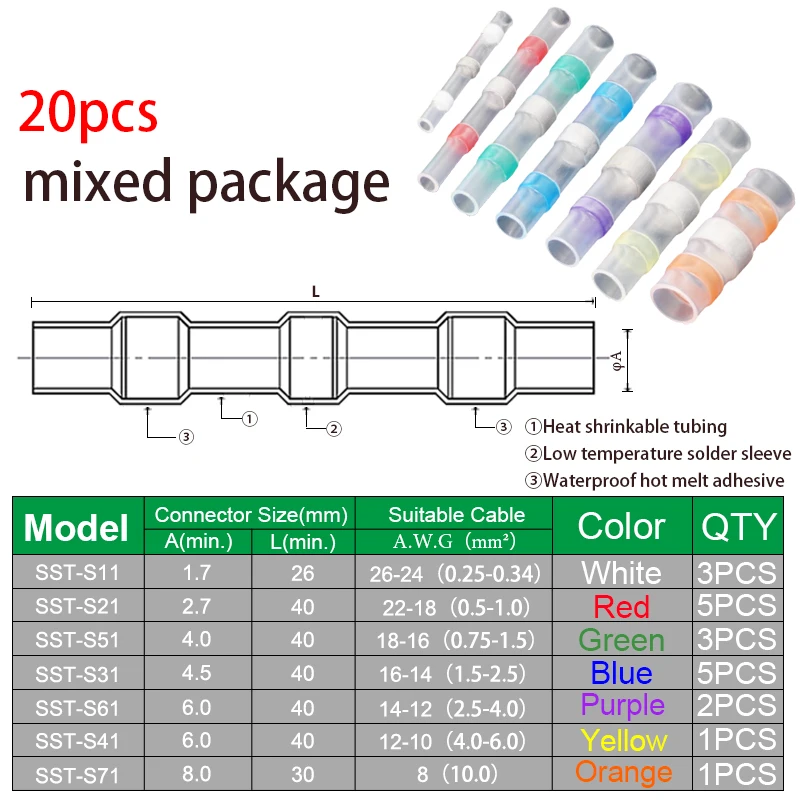 Термоусадочные соединители для проводов 102030 шт., SST21, водонепроницаемая втулка AWG22-18, стыковое электрическое соединение, клемма с луженым припоем