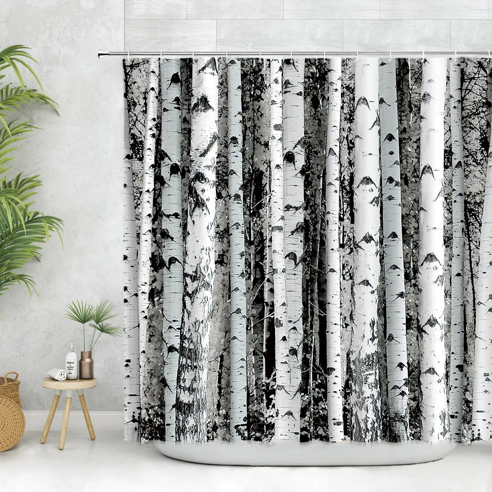 Занавеска для душа с изображением черного, белого леса, силуэт, сосновый лес, семейный олень, птицы, коричневая декоративная занавеска из полиэстера для ванной комнаты, s-образный крючок