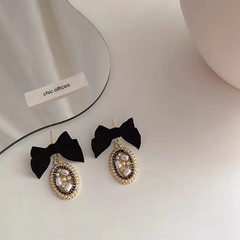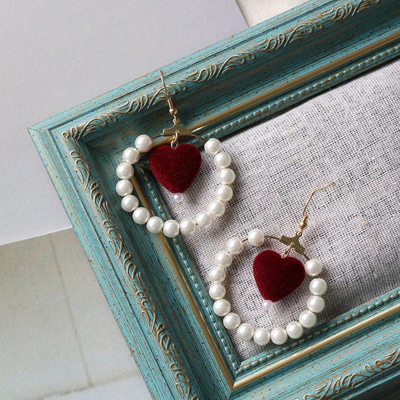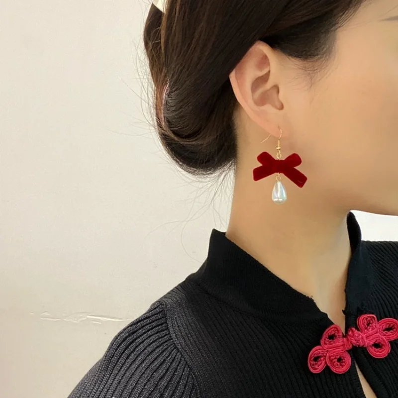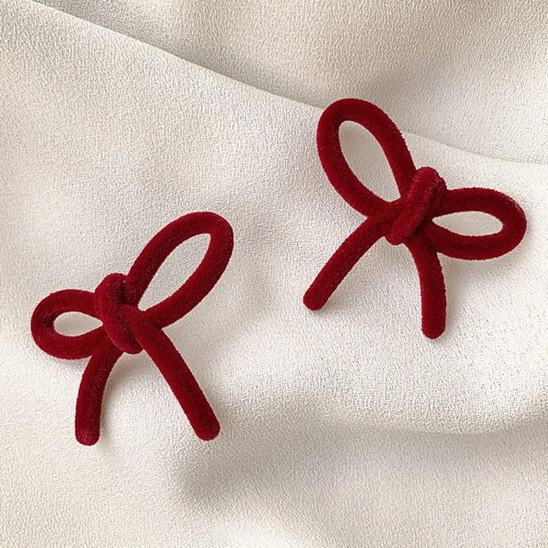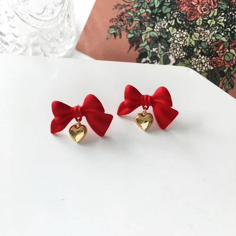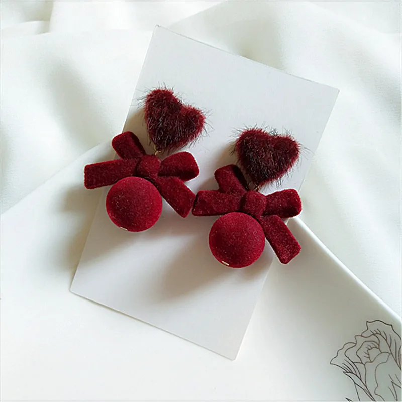 Рождественские серьги-подвески с красным бантом для женщин, темпераментные серьги в форме сердца с Флокированным бантом, Фотоэлементы для девочек, новый год