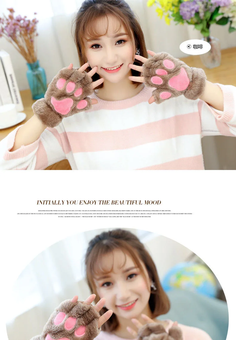 Зимние женские перчатки, милые искусственные плюшевые варежки, теплые мягкие короткие пушистые перчатки без пальцев с изображением медведя