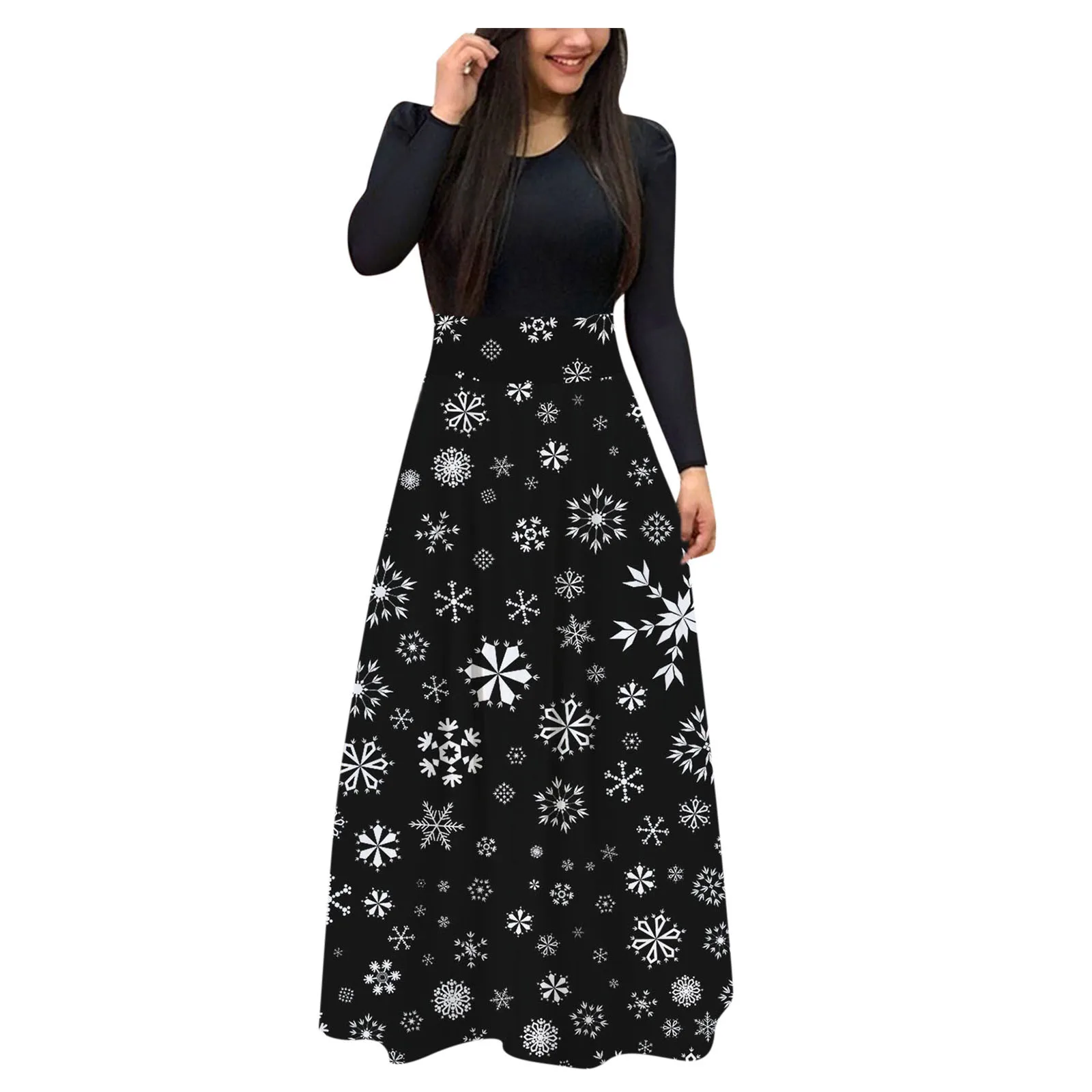 Женское рождественское платье с длинным рукавом и круглым вырезом, Черное Платье макси с принтом снежинок 1920-х годов, элегантные платья для женщин