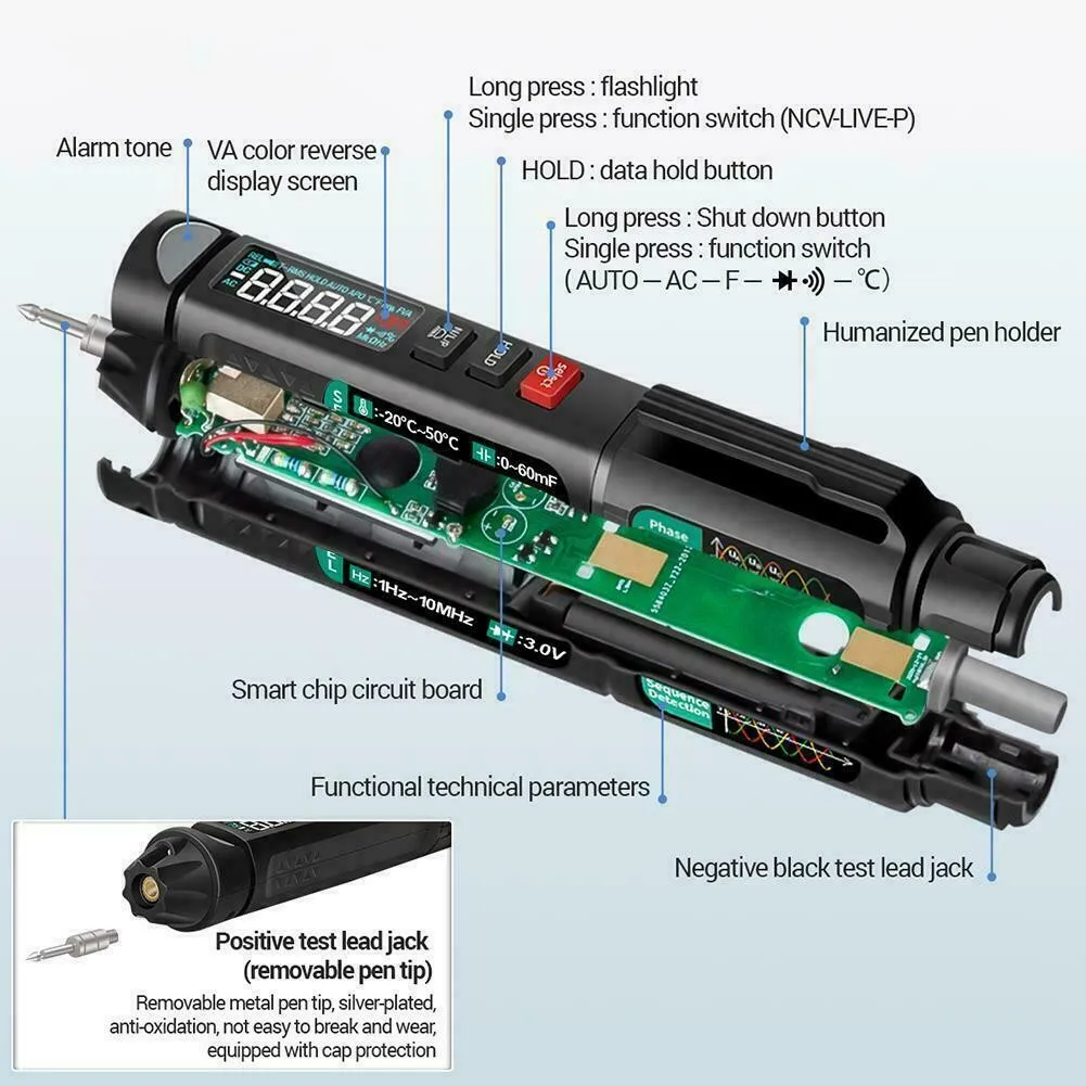 * 6000 отсчетов цифровой мини умный мультиметр* Обнаружение фазы* Ncv Индукционное Обнаружение* Сопротивление/Емкость* Диод/обнаружение в реальном времени/Гц* Температура тока* Это новый обновленный профессиональный мини-мультиметр, и он может бытьВозможность Тестирования и обслуживания электрического оборудования.Параметр: