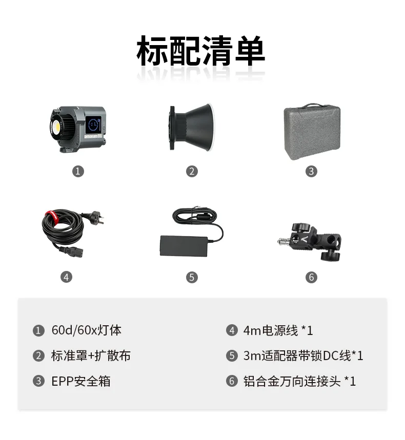 【Bowens крепление дизайн: Amaran COB 60x поставляется в стандартном комплекте с интеллектуальным двойным блоком питания, адаптером питания, опорной колонкой и мини-стандартным покрытием, который может быть использован идеально с светильник Bowens рот светильник аксессуары управления, например: свет Aputure светильник купол SE, светильник Dome Mini II, Aputure фонарь, Мягкий светильник-зонт и т. Д.