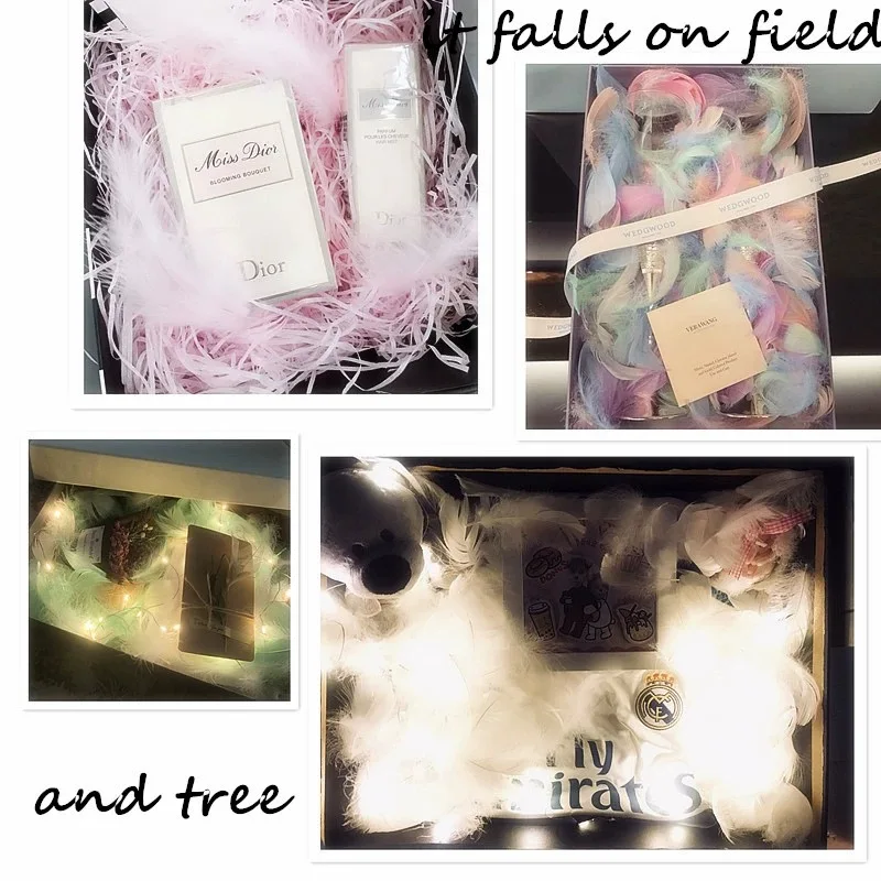 Емкости:Размер коробки: 14x14x10cm ----- 3 сумки с перьямиРазмер коробки: 21x21x12cm ----- 6 мешков перьев