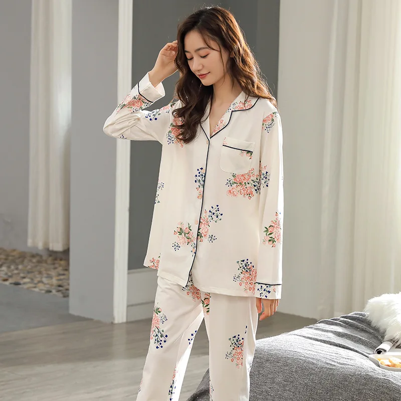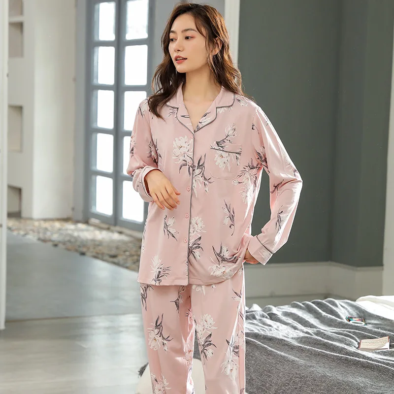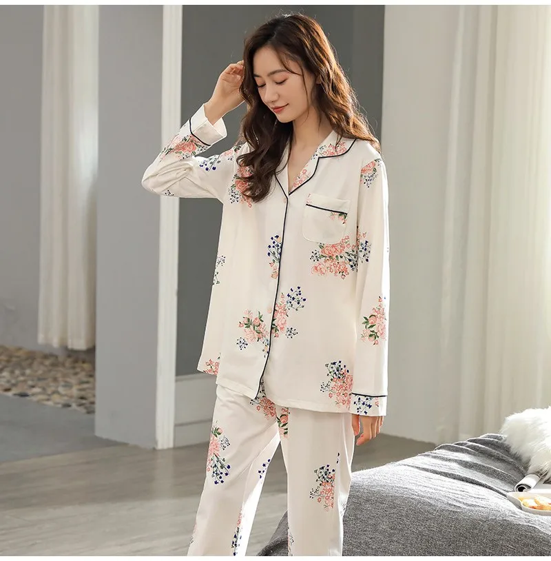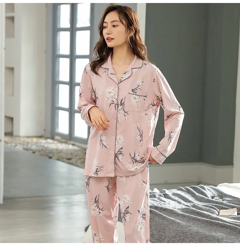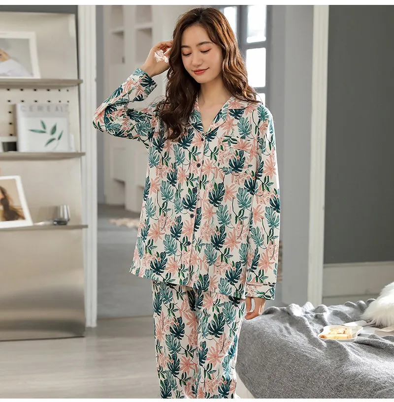 Хлопковая Домашняя одежда с цветочным принтом, Женская весенне-осенняя свободная пижама из 2 предметов, Повседневная Пижама с длинным рукавом, удобная одежда для сна