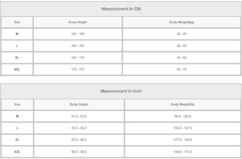 Измерение в смРазмерыПлечоГрудьДлина корпусаРукавДлина брюкВысота корпусаМасса тела (кг)М391006455,594155 - 16040 - 48L40104665797160 - 16548 - 58XL411086858,5100165 - 17058 - 68XXL421127060103170 - 17568 - 78Измерение в дюймахРазмерыПлечоГрудьДлина корпусаРукавДлина брюкВысота корпусаМасса тела (фунты)М15,439,425,221,937,061,0-63,088,0-105,6L15,740,926,022,438,263,0-65,0105,6-127,6XL16,142,526,823,039,465,0-66,9127,6-149,6XXL16,544,127,623,640,666,9-68,9149,6-171,6