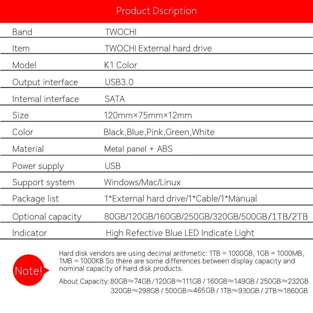Внешний жесткий диск twochi'', USB 2 ТБ, 1 ТБ, 500 Гб, портативный ...