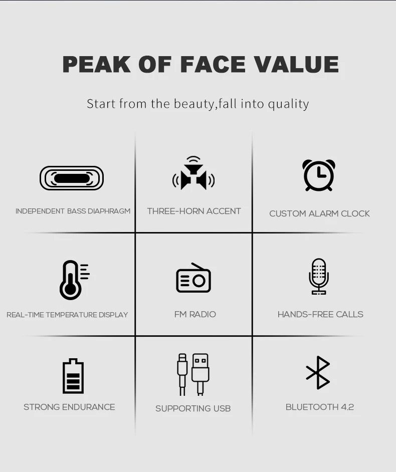 Вход: AUX, tf-карта, USB, Bluetooth, FM радио USB: Поддержка u-диска tf-карта: поддержка до 32 ГБ версия Bluetooth: V4.2 Расстояние передачи: 10 м встроенный литий Батарея: 7,4 V/2000 мА/ч, Материал корпуса; Пластик зарядки: прямые DC5V/1.5A искажения: менее чем 1% расчетная мощность: 25 Вт одновременное подключение двух телефонов да амплитудно-Частотная характеристика: 60 Гц-15 кГц FM Радио Частота: 87,5-108 МГц Размеры: 17,5*10,8*11,8 см чистая Вес: 1,1 кг