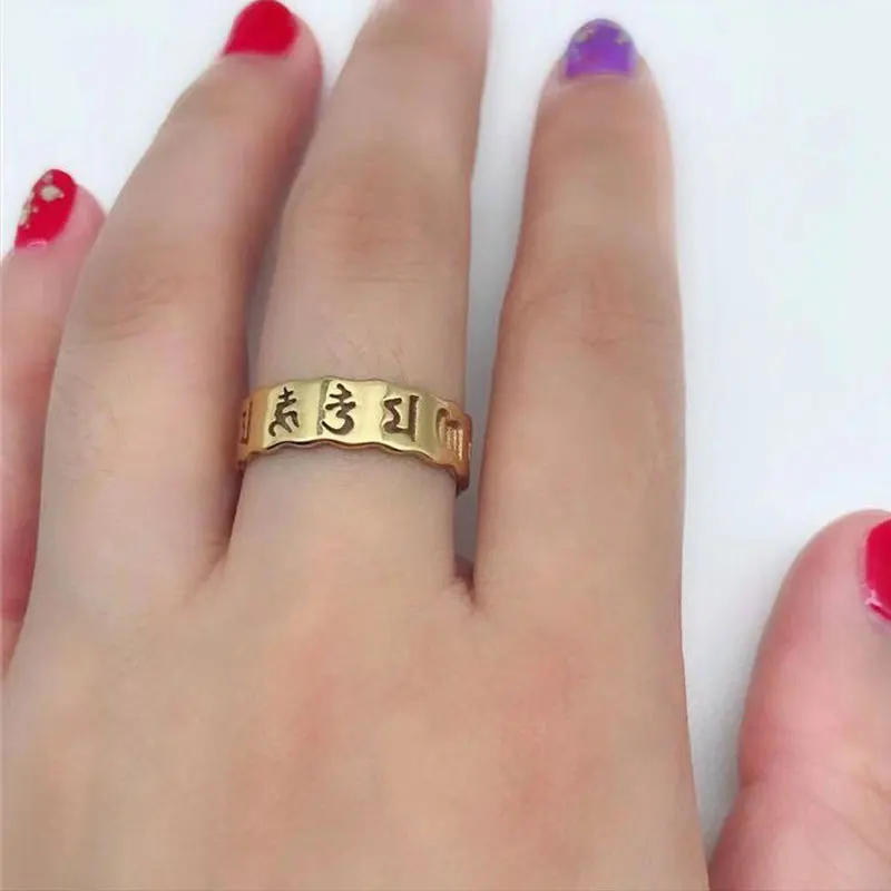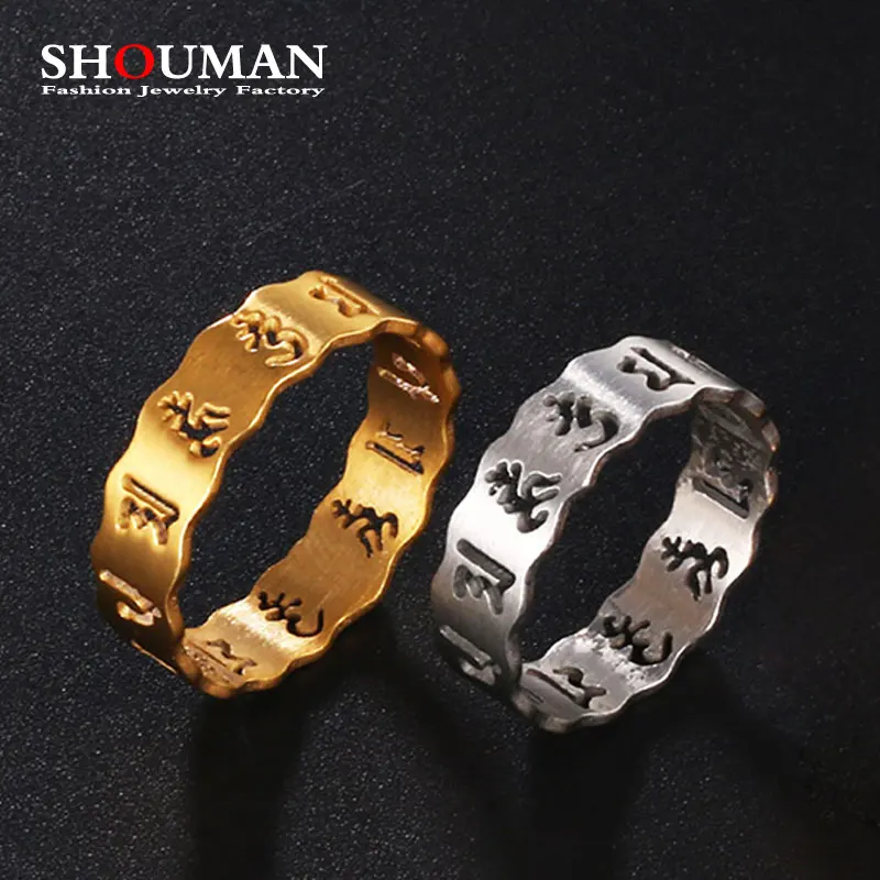 Кольцо из нержавеющей стали для мужчин и женщин, полая бижутерия в стиле притчи и буддизма SHOUMAN из шести слов, золотистое и серебристое кольцо для пары, Подарочная бижутерия