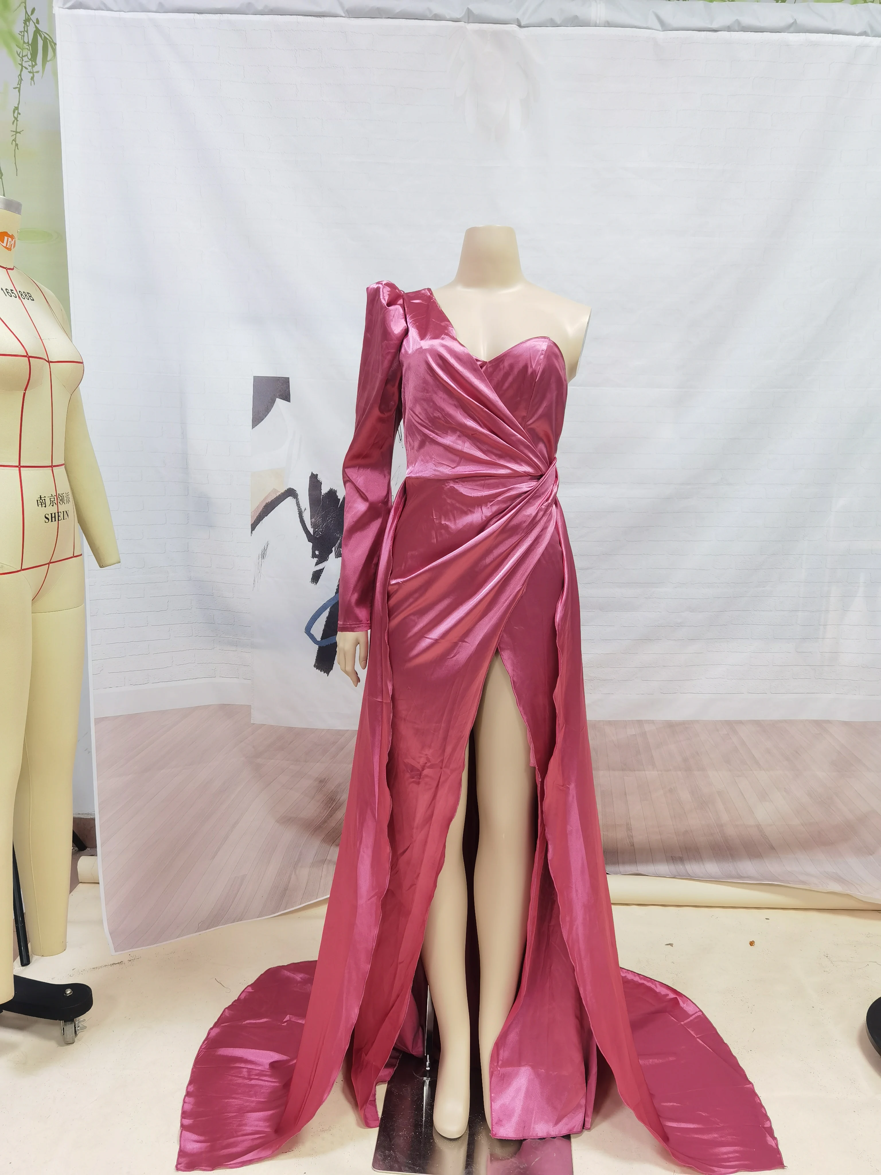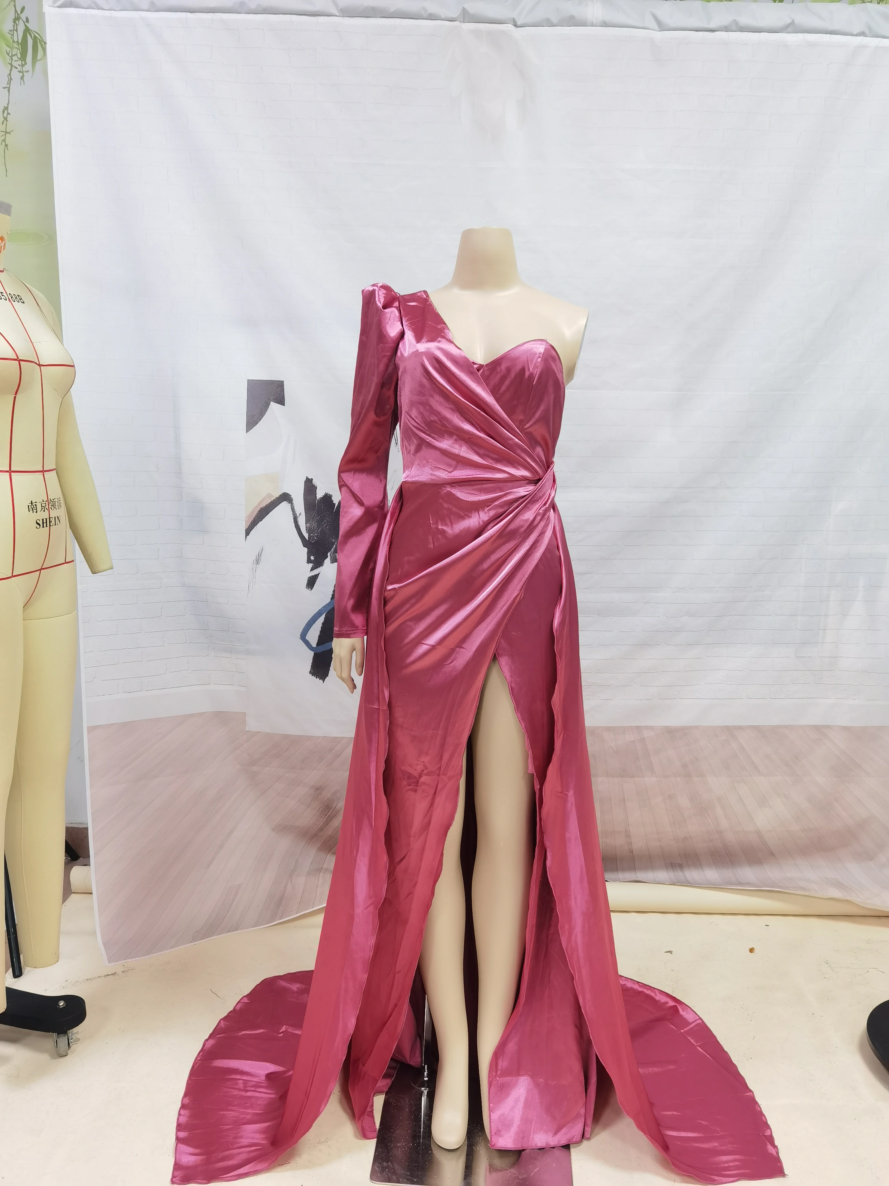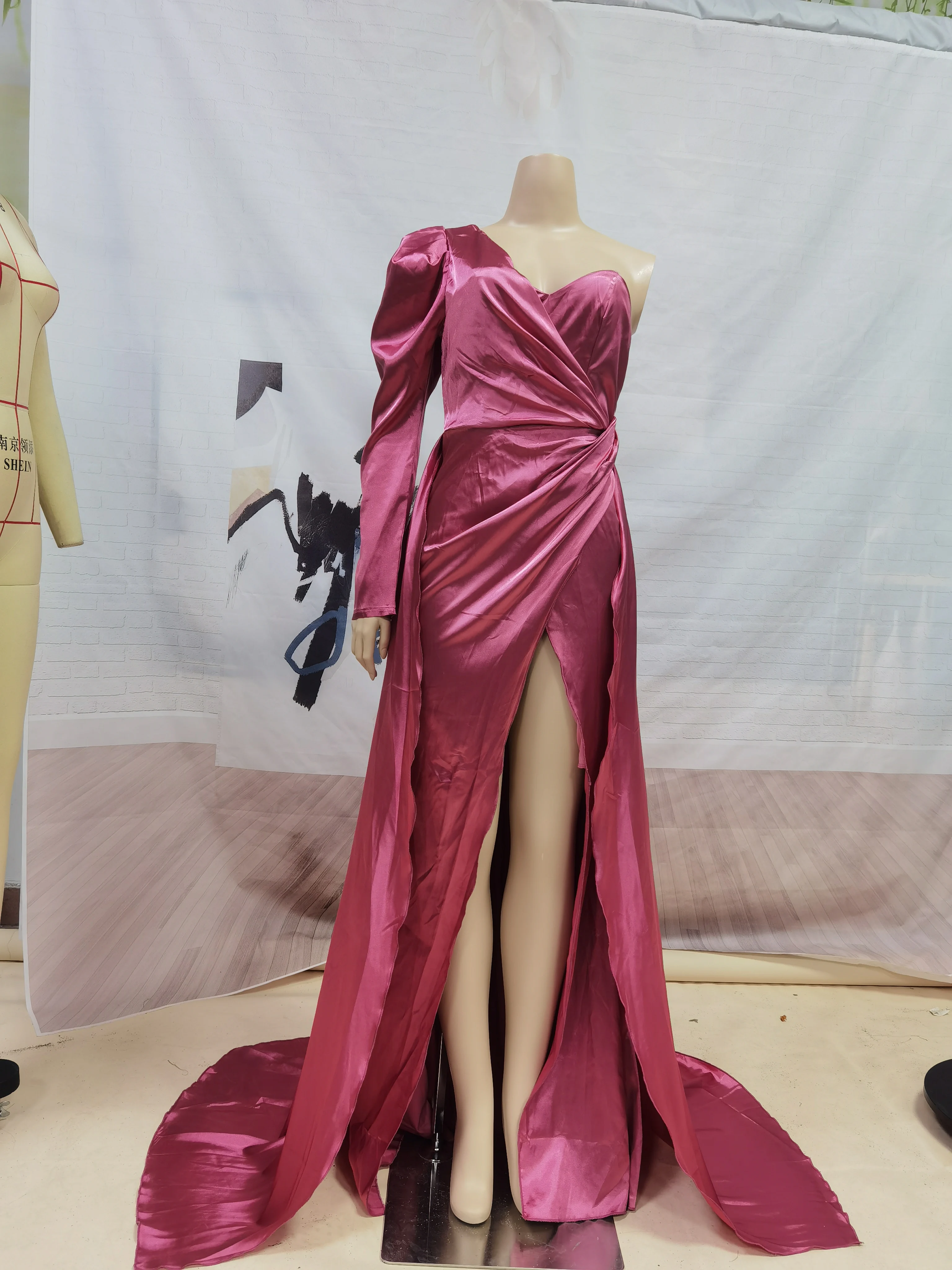 Атласное платье в рубчик с разрезом на одно плечо для выпускного ве...