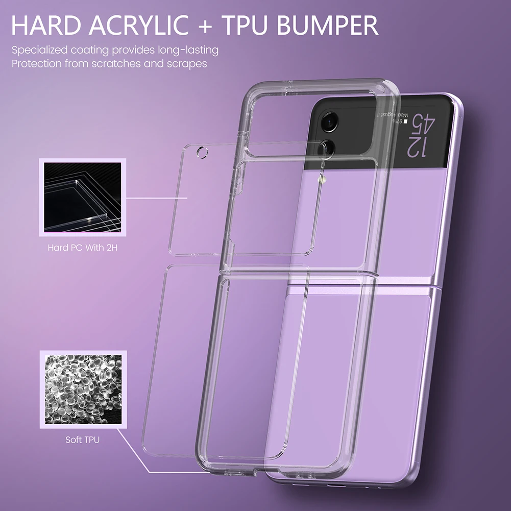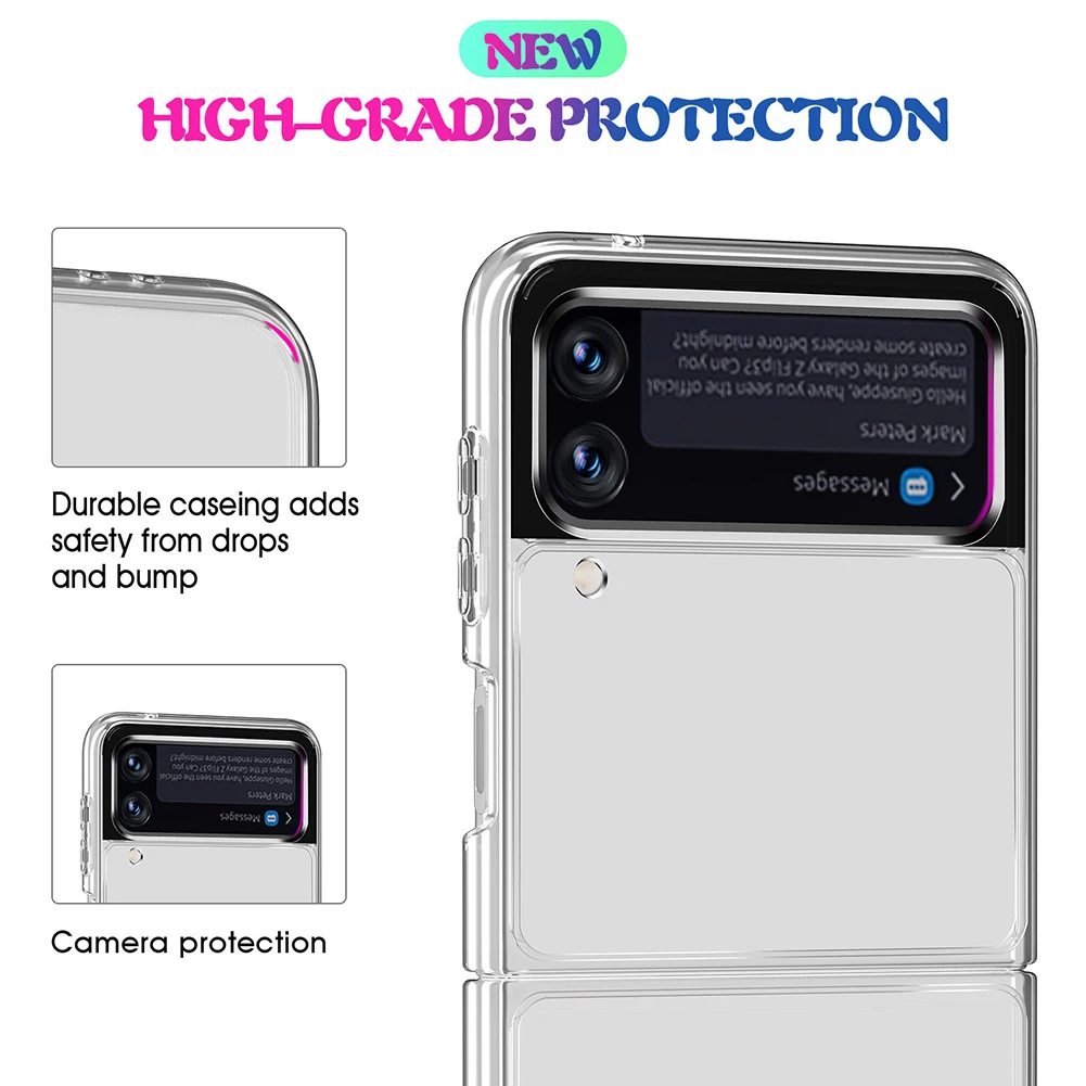 Прозрачный Бампер для смартфона, защитный чехол для Samsung Galaxy Z Flip 3 5G, ударопрочный анти-осенний мобильный телефон, чехолХарактеристика:1. Легкий и портативный. Этот чехол для телефона специально сделан для Samsung Galaxy Z Flip3 5G. Использование высококачественного ТПУ + поликарбоната, полые твердые кнопки. Гибкий на ощупь, чувствительный и удобный.2. Слегка выпуклая конструкция, защита от падения на 360 °. Четыре угла приподняты для защиты яркой поверхности и защиты объектива. Для защиты четырех углов спины добавлен новый выступ в форме дуги, И новый дизайн с микро-подкладкой arc добавлен, чтобы эффективно избежать царапин камеры, когда телефон помещается на рабочем столе.3. Новая усовершенствованная Защита от царапин Спереди и сзади. Задняя часть выступ ТПУ 0,5 мм выше, чем панель, и уход за кожей лица обруч 1,3 мм выше, чем на экране. Конструкция защиты особенно выше, чем Высота линзы, чтобы эффективно защитить безопасность объектива.4. Защита качества. Высококачественная ТПУ Мягкая кромка + ПК прозрачная задняя поверхность 2H твердость, может защитить ваш телефон от пыли, царапин и внешнего воздействия.5. Легко заряжать. Чехол сохраняет порт зарядки, вы можете зарядить телефон, не снимая защитный чехол, и вы можете легко использовать все функции.Спецификация:Название: защитный чехол на мобильный телефонМатериал: ТПУ + ПКЦвет: прозрачныйПодходящая модель: для Samsung Galaxy Z Flip3 5GВес: 30 гРасширенный размер: 16.6x7.22x0.69 см/6.54x2.84x0.27inПримечание:В связи с различиями мониторов и эффектами освещения реальный цвет товара может немного отличаться от цвета на фотографиях. Спасибо!Возможны незначительные отклонения в измерениях из-за ручного измерения.