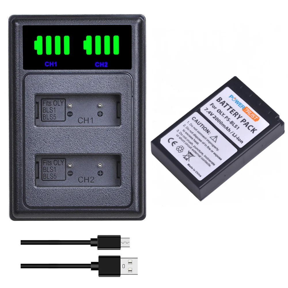 Аккумулятор 2000 мАч BLS1 PS-BLS1 + двойное зарядное устройство со светодиодной подсветкой и USB Type-C для Olympus