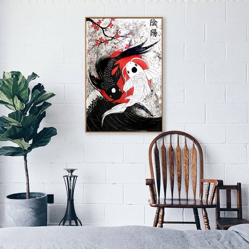 Японский Зонт гейши, девушка и рыба Инь-Ян, искусство, печать на холсте, живопись, Настенная картина, гостиная, современный плакат для украшения дома