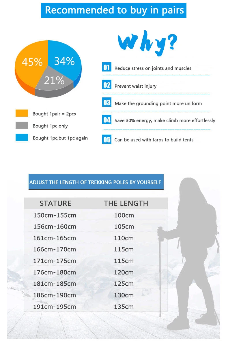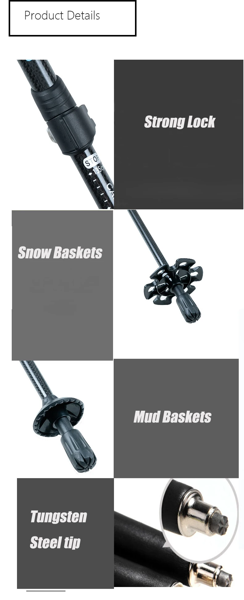 Преимущества:1. Кожаный ремешок-очень легкий, дышащий ремешок, обеспечивающий максимальный комфорт при минимальном весе2. Новая эва пробковая ручка дизайн может помочь лыжным любителям с лыжами3. Более надежный Алюминиевый Внешний замок4. Сменный наконечник из вольфрамовой стали
