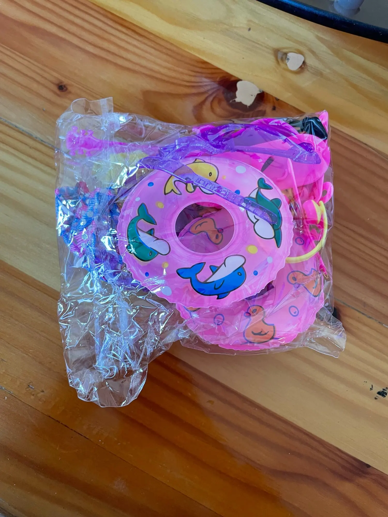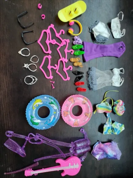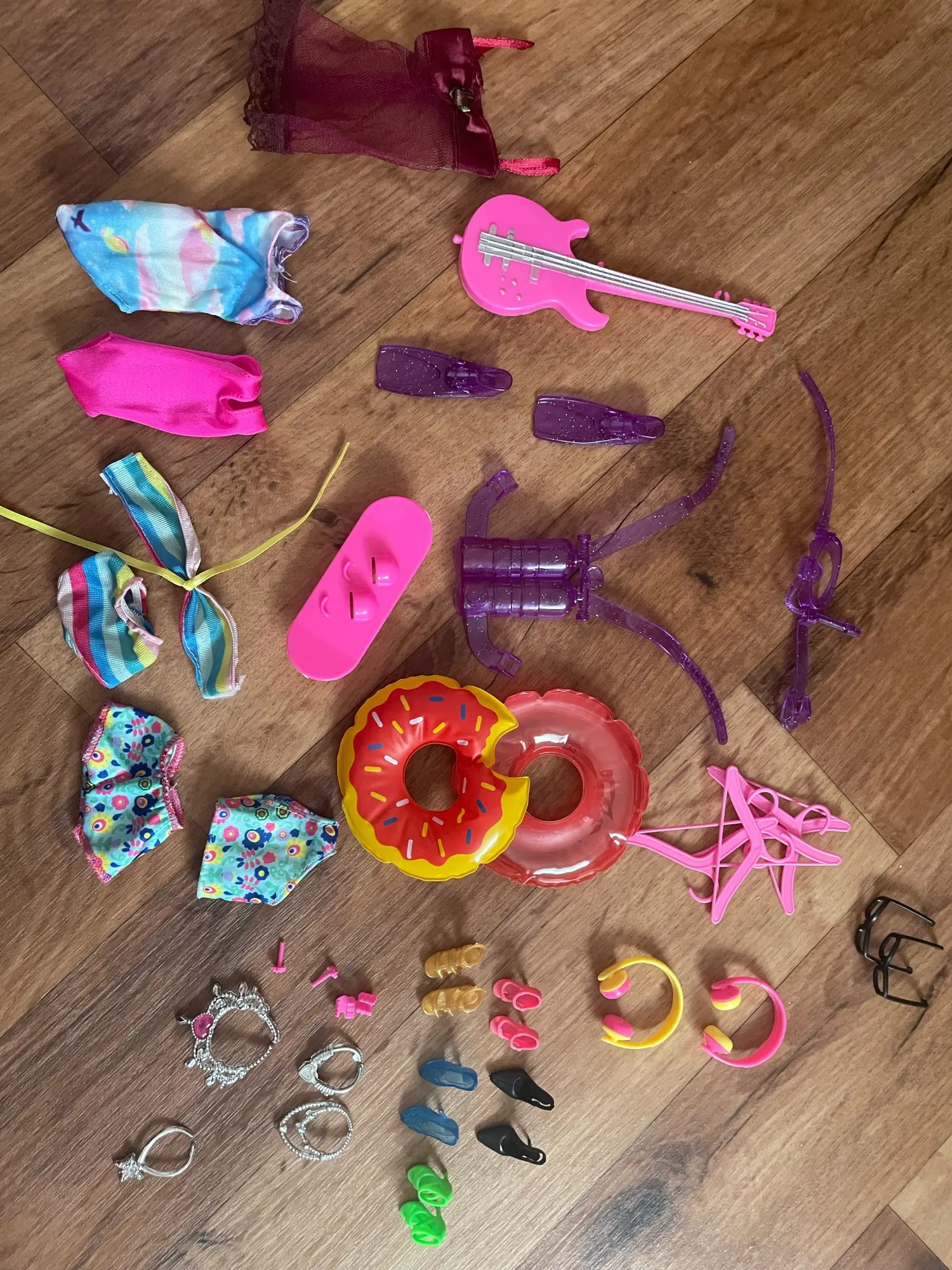 Вещей гораздо меньше, и те почти все не налазят на куклу Барби. Круга надувных всего два. Ласты малы.