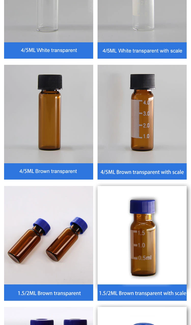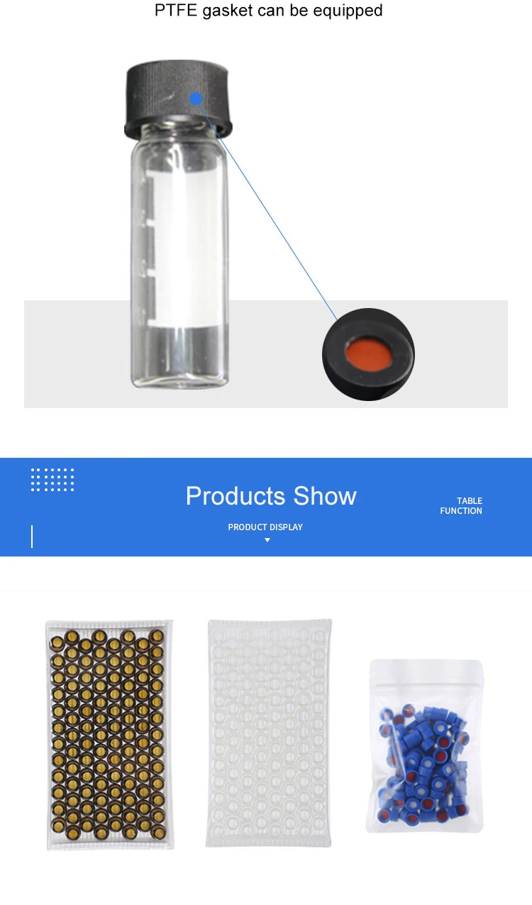 1. Красный PTFE/Белый силиконовый Septa синий короткий винт-резьба PP крышка 6 мм Центр отверстие. 2. Флакон: прозрачный стеклянный флакон Hplc объемом 2 мл. Упаковка: 100 шт/коробки