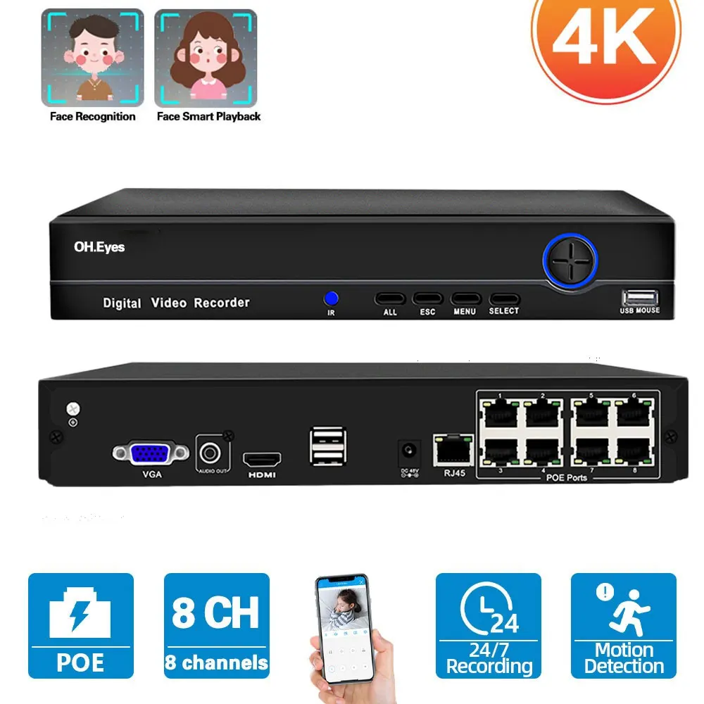 Сетевой видеорегистратор 8MP H.265 POE NVR, устройство для обнаружения лиц, 8 каналов, 4K RJ45, P2P IP-камера, XMEYE