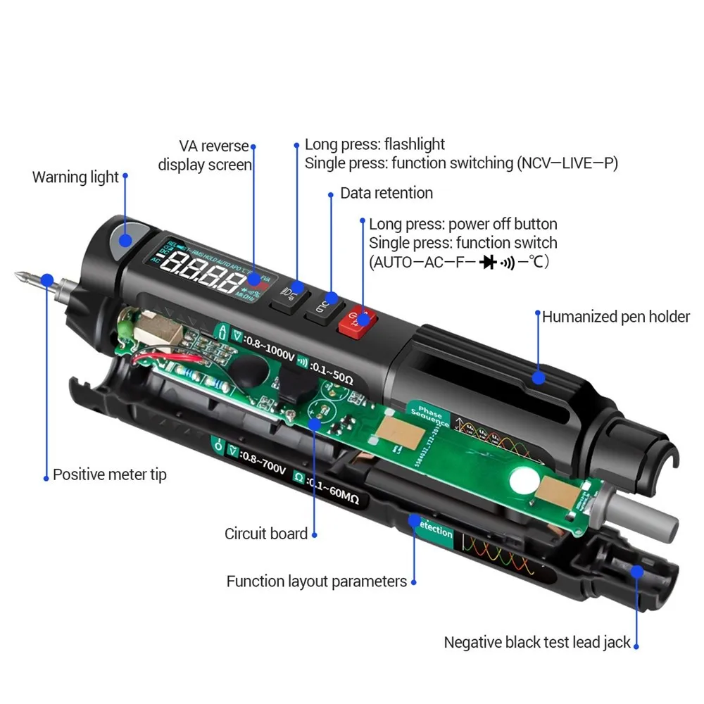 * 6000 отсчетов цифровой мини умный мультиметр* Обнаружение фазы* Ncv Индукционное Обнаружение* Сопротивление/Емкость* Диод/обнаружение в реальном времени/Гц* Температура тока* Это новый обновленный профессиональный мини-мультиметр, и он может бытьВозможность Тестирования и обслуживания электрического оборудования.Параметр: