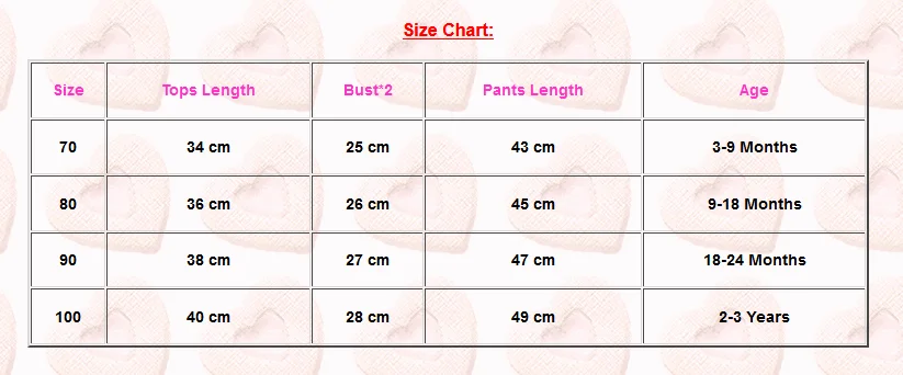 Размеры Длина топа Бюст * 2 Длина брюк Возраст 70 34 см 25 см 43 см 3-9 месяцев 80 36 см 26 см 45 см 9-18 месяцев 90 38 см 27 см 47 см 18-24 месяцев 100 40 см 28 см 49 см От 2 до 3 лет