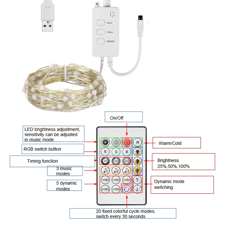 -Работа с: Amazon alexa и Google assistance.-Способы управления: 24 клавиши управления ler/ App remote vontrol/ voice vontrol.-Название приложения: Smart life, Tuya smart.-Беспроводной режим: Wi-Fi 2,4 ГГц/Bluetooth 5,0-Цвета: 16 миллионов цветов на ваш выбор, вы можете изменить цвета, которые вам нравятся.-Яркость: гирлянда с регулируемой яркостью, поэтому вы можете затемнить яркость с помощью приложения или Alexa.-Настройка расписания: позволяет установить таймеры для включения/выключения, даже если вы не дома.-Синхронизации с музыкой: 24 клавиши контроллер встроенный Bluetooth с микрофоном, таким образом, цвет изменится синхронизации с музыкальный объемного звучания.-Питание USB ed: Сказочный светильник разработан с интерфейсом USB, легко найти источник питания для подключения.