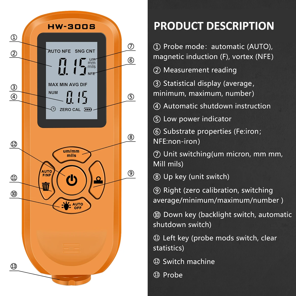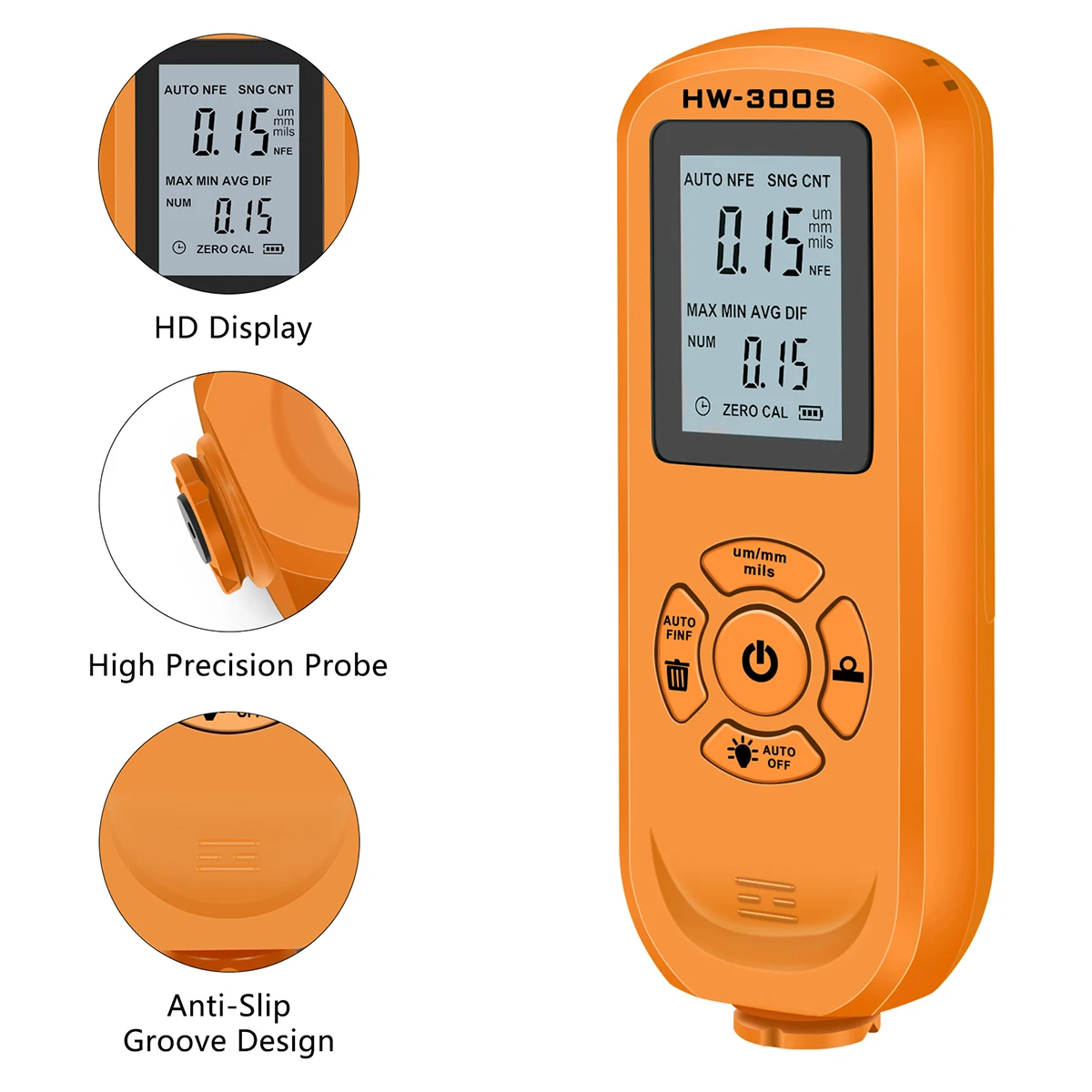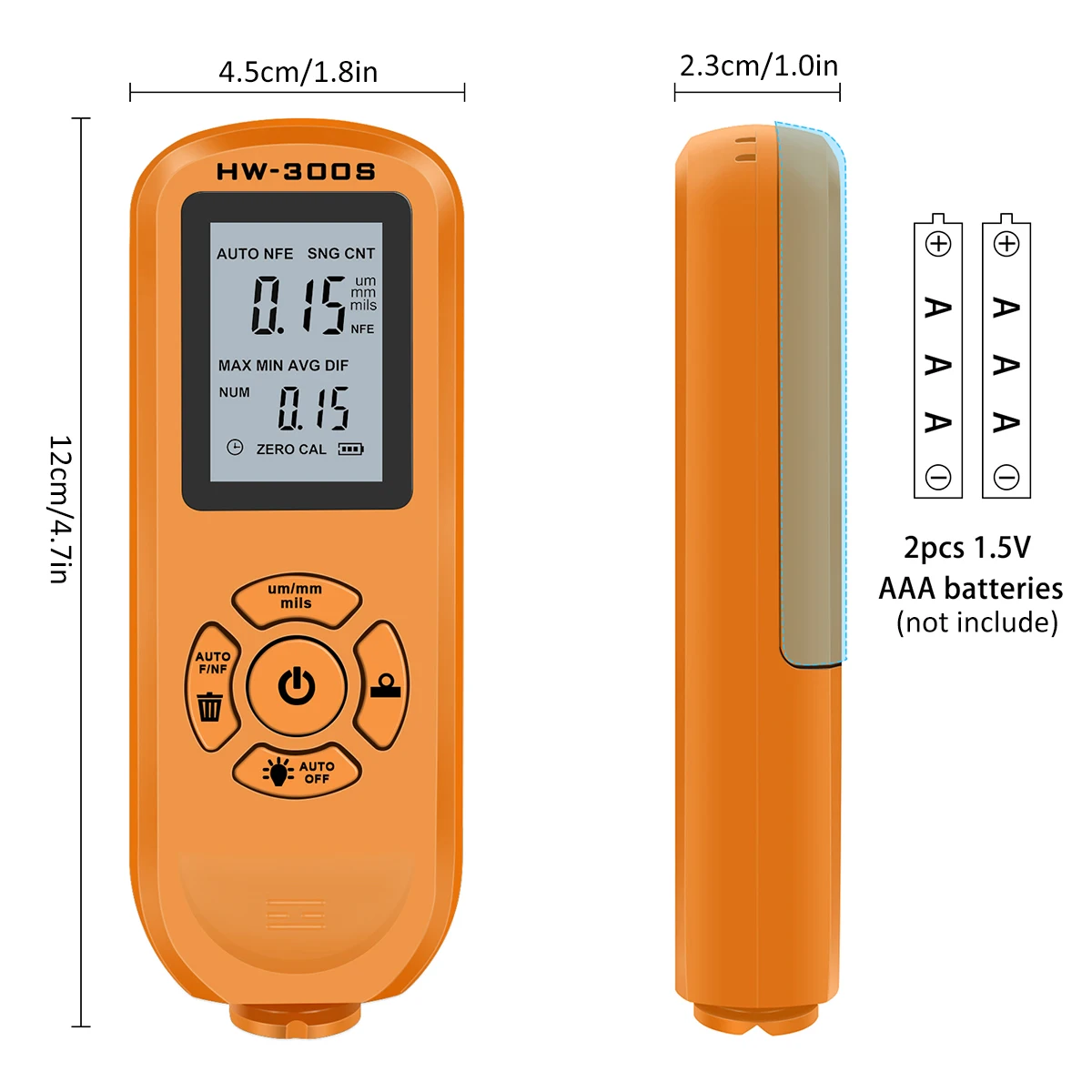 Detailed description:Name: HW-300S Coating Thickness GaugeMaterial: ABSColor (Optional): Black/OrangeResolution: 0.01mm/1milMeasuring Range: 0-2000UMMeasurement Accuracy: ±(3%+1UM)Dimensions: 120 x 45 x 23 mmPower Supply: 2 1.5V AAA batteries (not included)Operating Temperature: -10 degrees Celsius and 50 degrees CelsiusCertification: CEApplication Scenarios: Widely used in used car painting, electroplating, surface technology, pipeline anti-corrosion coating, mechanical equipment surface anti-corrosion, chemical equipment, quality control, etc.