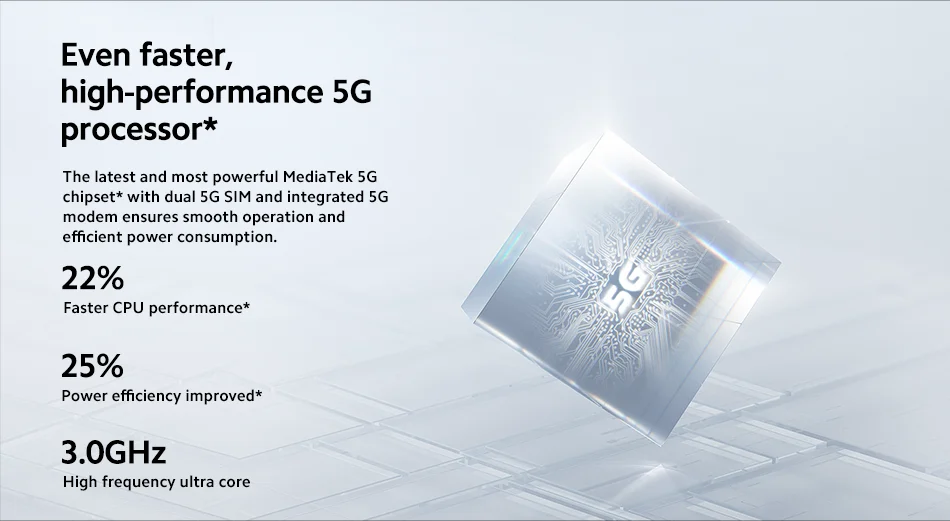 Новейший и самый мощный чипсет MediaTek 5G * с двумя 5G SIM и встроенным 5G-модемом обеспечивает плавную работу и эффективное энергопотребление.