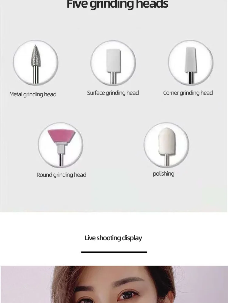 Материалы изделия; Абс + Шлифовальная головка (пять типов) и 4 режима полировки ногтей (передняя и задняя установка с быстрыми и медленными зубцами)