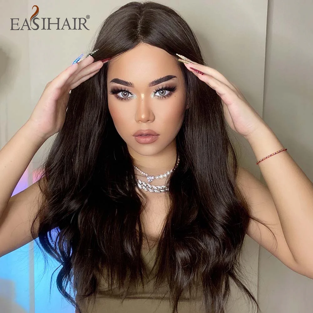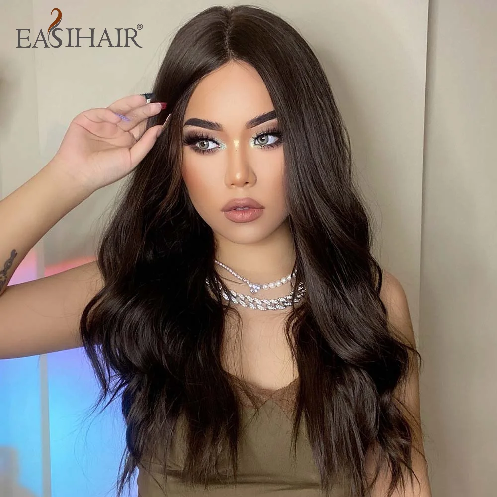 EASIHAIR, длинные темно-коричневые волнистые синтетические парики для женщин, средняя часть, термостойкие парики для женщин, Повседневные Вечерние парики для косплея