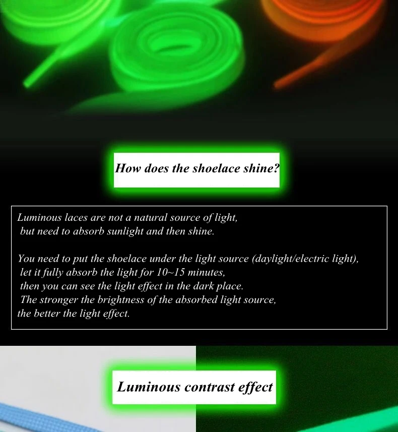 Примечание:Они должны поглощать светильник через солнечный светильник, светильник s, флэш-светильник s или даже движущиеся экраны.После 30 минут поглощения светильник излучает светильник в течение 4-5 часов.Чем сильнее светильник, тем лучше.Они могут светиться снова и снова!
