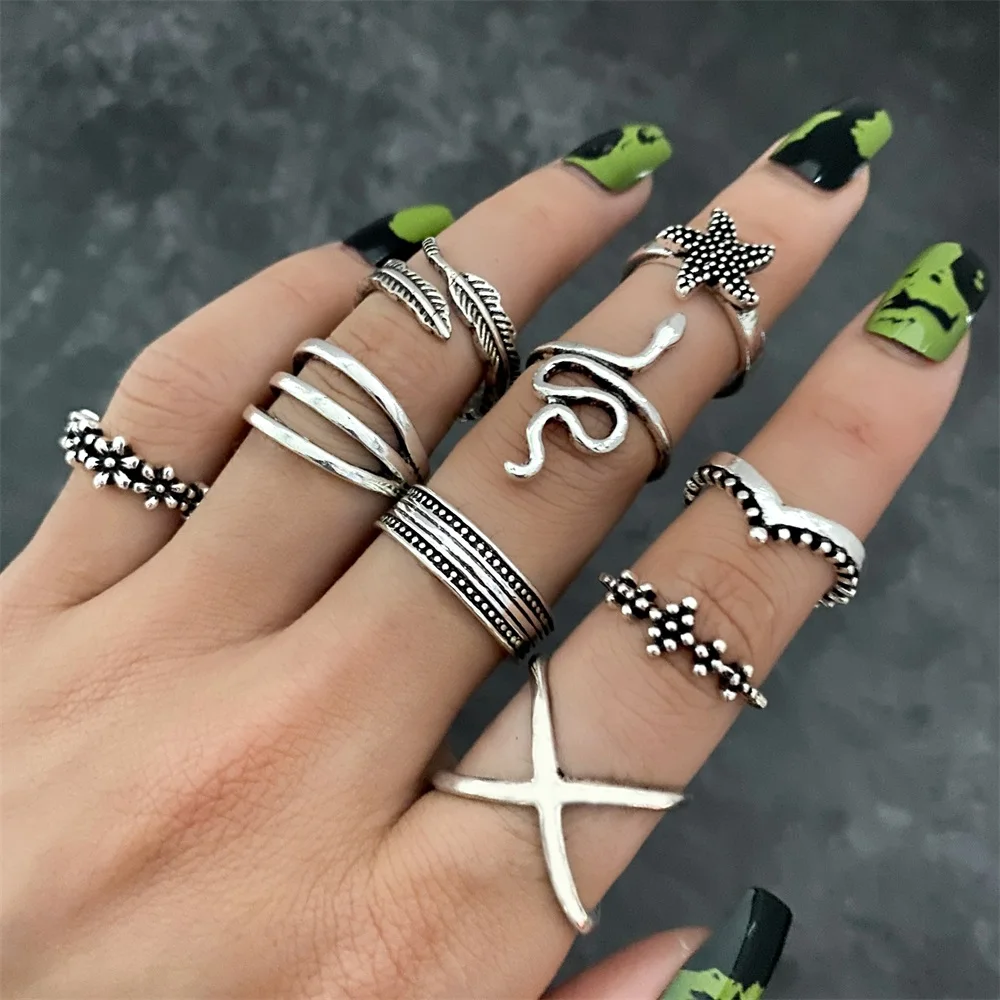 KISSWIFE Vintage Silver Color Rings Set For Women Men Leaves Crystal Black Stone Geometric Rings Fashion Jewelry