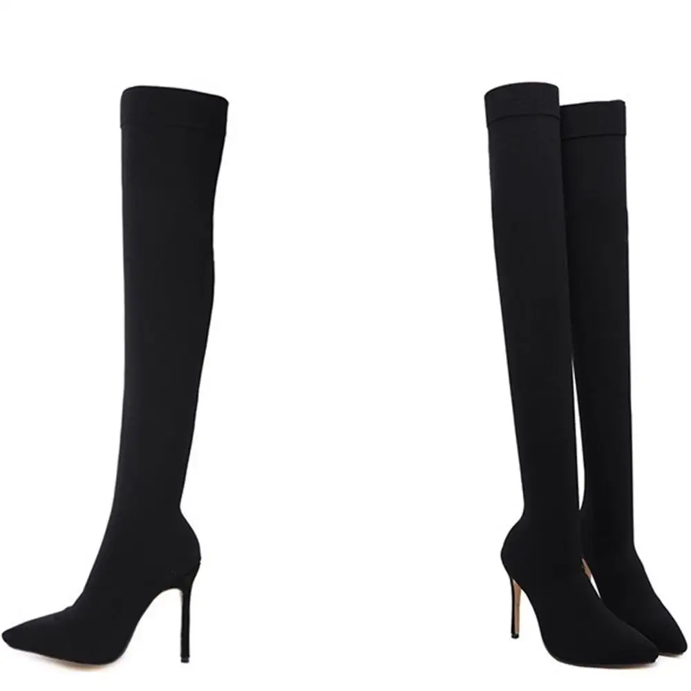 Женские сапоги выше колена, на тонком высоком каблуке, с острым носком