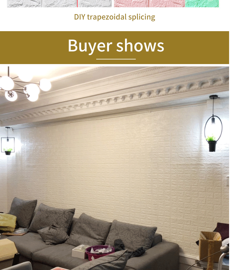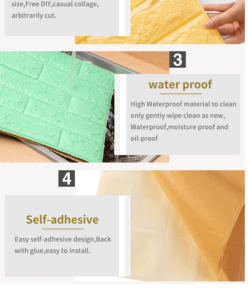 Описание:<Высокое качество: Изготовлен из высококачественного пенопласта XPE, защищает от столкновений детей, заботится о вашей семье. Водонепроницаемость, защита от влаги и звукоизоляция. Легкая чистка и обслуживание, нетоксичный, без запаха.<Самоклеящаяся конструкция: самоклеящаяся кожура и наклеиваемые обои, легкая паста и съемка.<Безопасно для вашей семьи: материал 3D кирпичной пены является безопасным, нет обнаружения вредных тяжелых металлов, высокое качество экологических стеновых декораций панелей.<Применение: Идеально подходит для стен, ТВ-стен, диванов, гостиной, спальни, кухни, детской комнаты, лестниц, столовой и так далее.<Идеальный декор: 3d-эффект и текстура, текстура 3D обоев сделана из мягкого пеноматериала XPE.<Простая установка:1. Тщательно очистите поверхность.2. Снимите клеевую пленку и приклейте обои к поверхности.3. Мягко гладьте обои, чтобы обеспечить их безопасность4. Разгладьте любые воздушные пузыри, когда вы двигаетесь вниз.