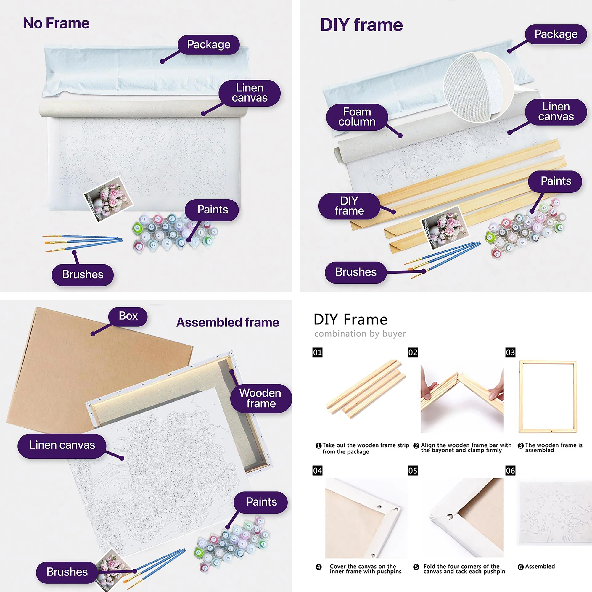 ·Льняной холст; 3 кисти; 1 Набор акриловой краски; Файл инструкции; Справочный лист; Рамка; Вешалка; Винты