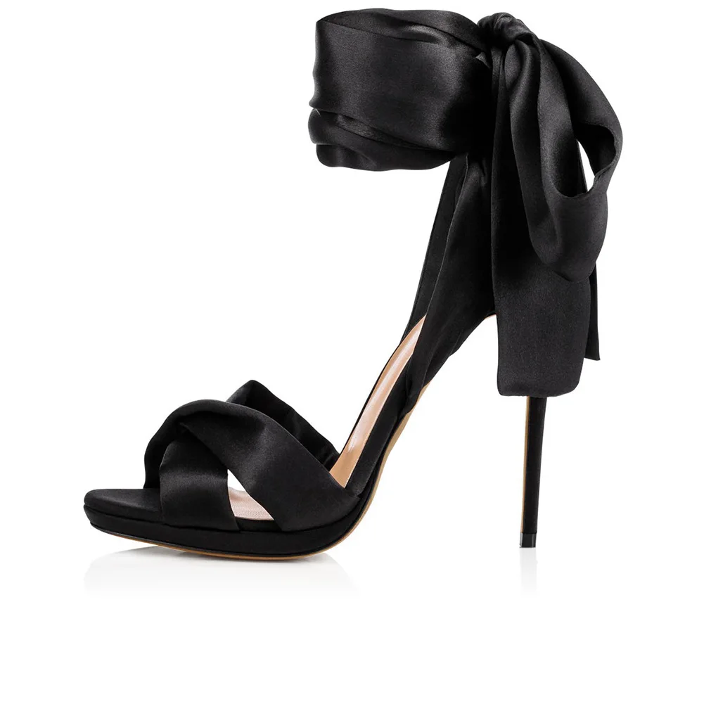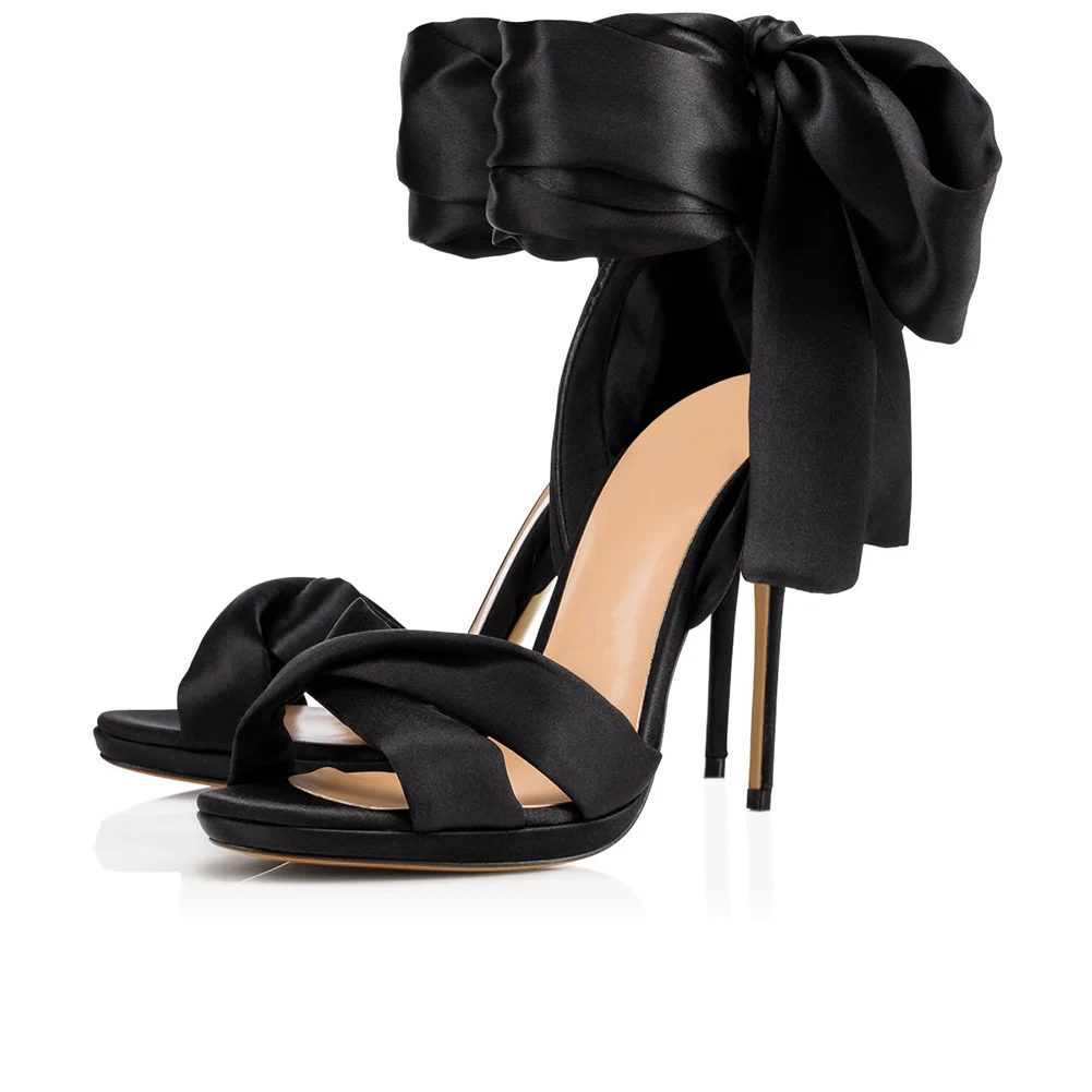 Туфли женские атласные на высоком каблуке, с открытым носком, черны...