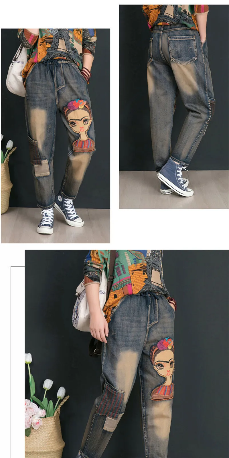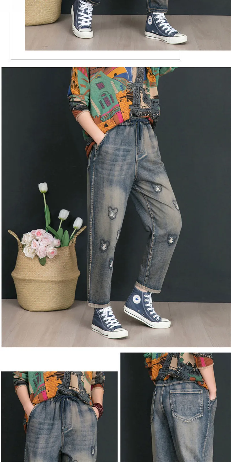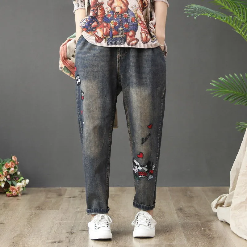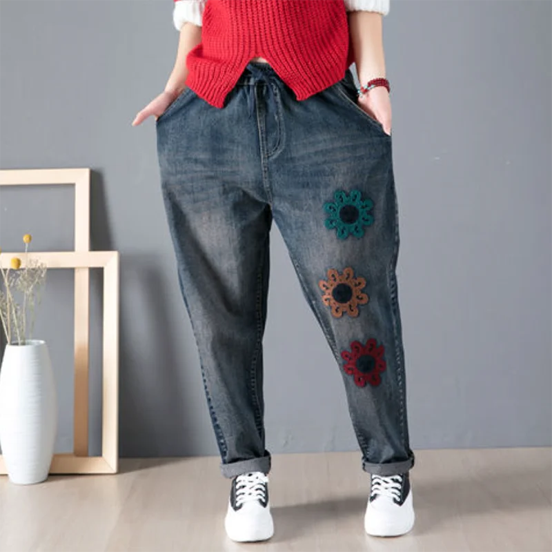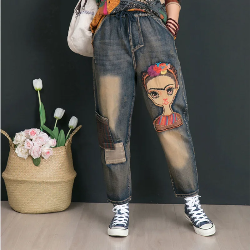 Джинсы женские демисезонные с высокой талией и вышивкой, в стиле ретро