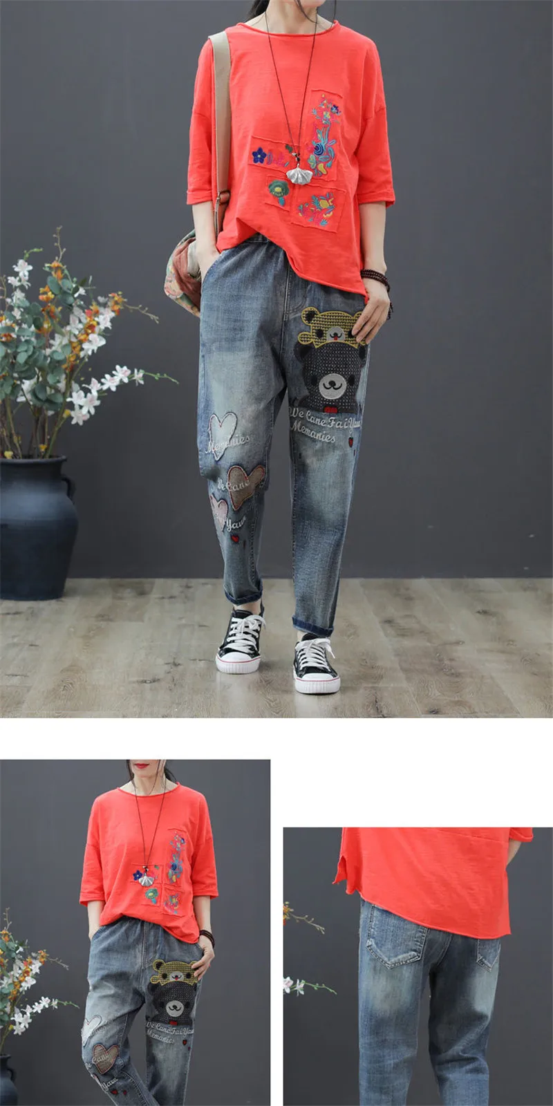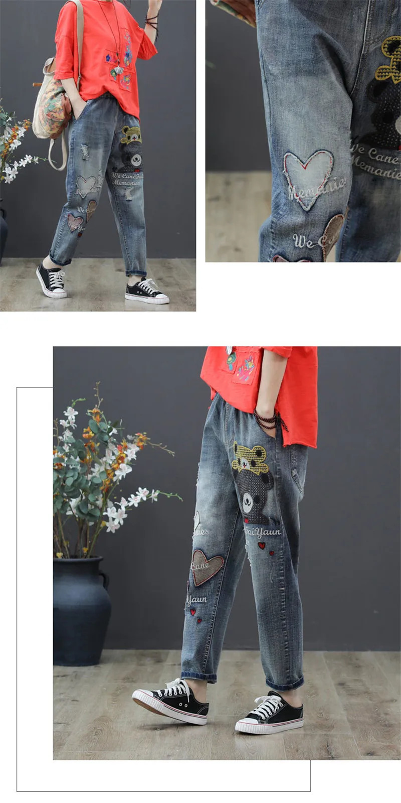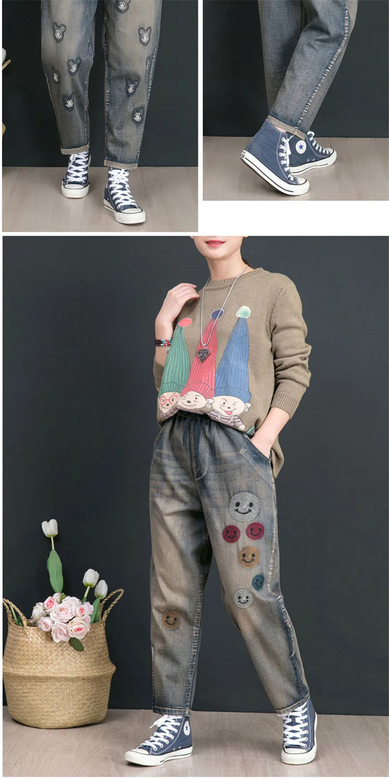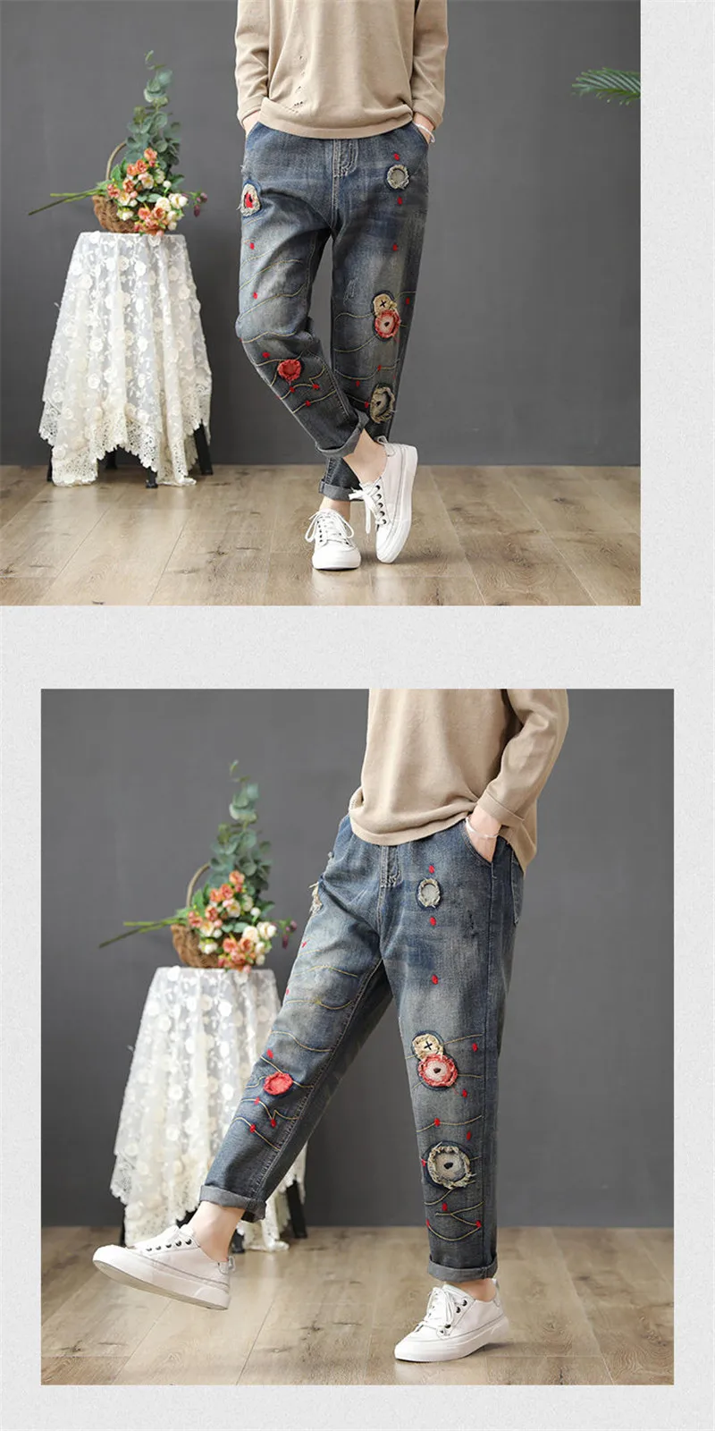 Джинсы женские демисезонные с высокой талией и вышивкой, в стиле ретро