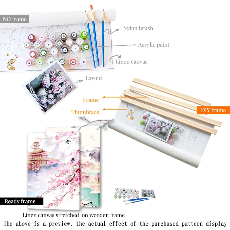 ·Льняной холст; 3 кисти; 1 Набор акриловой краски; Файл инструкции; Справочный лист; Рамка; Вешалка; Винты