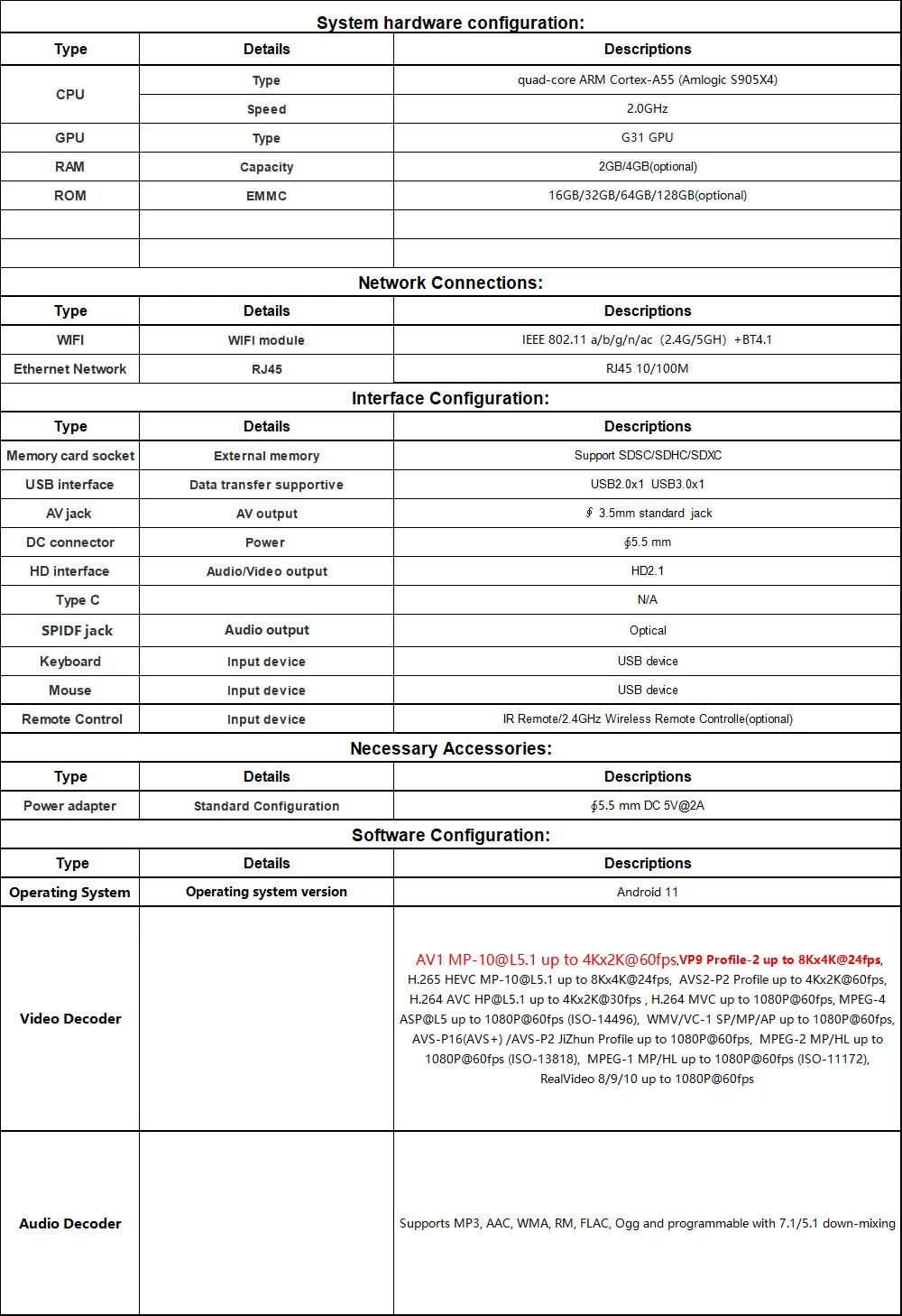 -CPU: четырехъядерный процессор Amlogic S905X4 ARM Cortex A55;-GPU:ARM Mali-G31;-ОС: Android 11;-Память: DDR3 2G/4 Гб памяти на носителе eMMC 16/32/64/128 ГБ-Поддержка H.265, 8K @ 24fps, 4K @ 60fps, HD 2,1, USB3.0;-Поддержка 10/100M Ethernet, 2,4 и 5G двухъядерный процессор Wi-Fi;-Поддержка: AV1, светильник RGB и сменные обои;-Поддержка: медиасервер PLEX, Youtube HD 4K;-Поддержка беспроводного обновления (OTA).