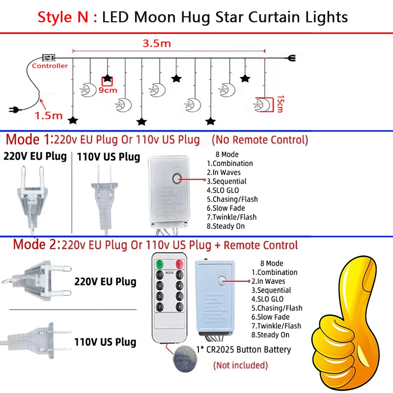 Стиль E:СВЕТОДИОДНЫЙ занавес в форме сердца светильник Характеристики: Цвет: теплый белый, разноцветный Водонепроницаемость: IP44 Материал: медная проволока + пластиковая крышка Количество подвесок: 6 в форме большого сердца, 6 в форме маленького сердца Длина: 3,5 м Высота: 0,5 м-0,8 м Напряжение: 220 В переменного тока/110 В Стандарт штепсельной вилки: штепсельная вилка европейского стандарта/штепсельная вилка американского стандарта Свинцовый провод (линия): 1,5 м 8 режимов • Питание: 1. Постоянный светильник режим 2. Режим вспышки 3. Мигающий режим 4. Непрерывный режим 5. Режим волны 6. Fantasy 7. Свое существование режим 8. Медленный режим вспышки Режим 1:220 В штепсельная вилка европейского стандарта или 110 В штепсельная вилка американского стандарта (без пульта дистанционного управления) Режим 2:220 В ЕС штекер или 110 В, штепсельная вилка стандарта США + пульт дистанционного управления Управление Модель батареи дистанционного управления: 1 * CR2025 кнопочный аккумулятор(Не входит в комплект)