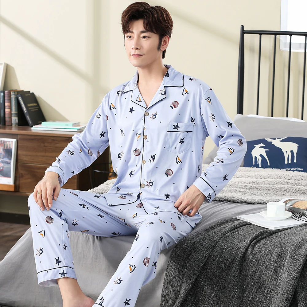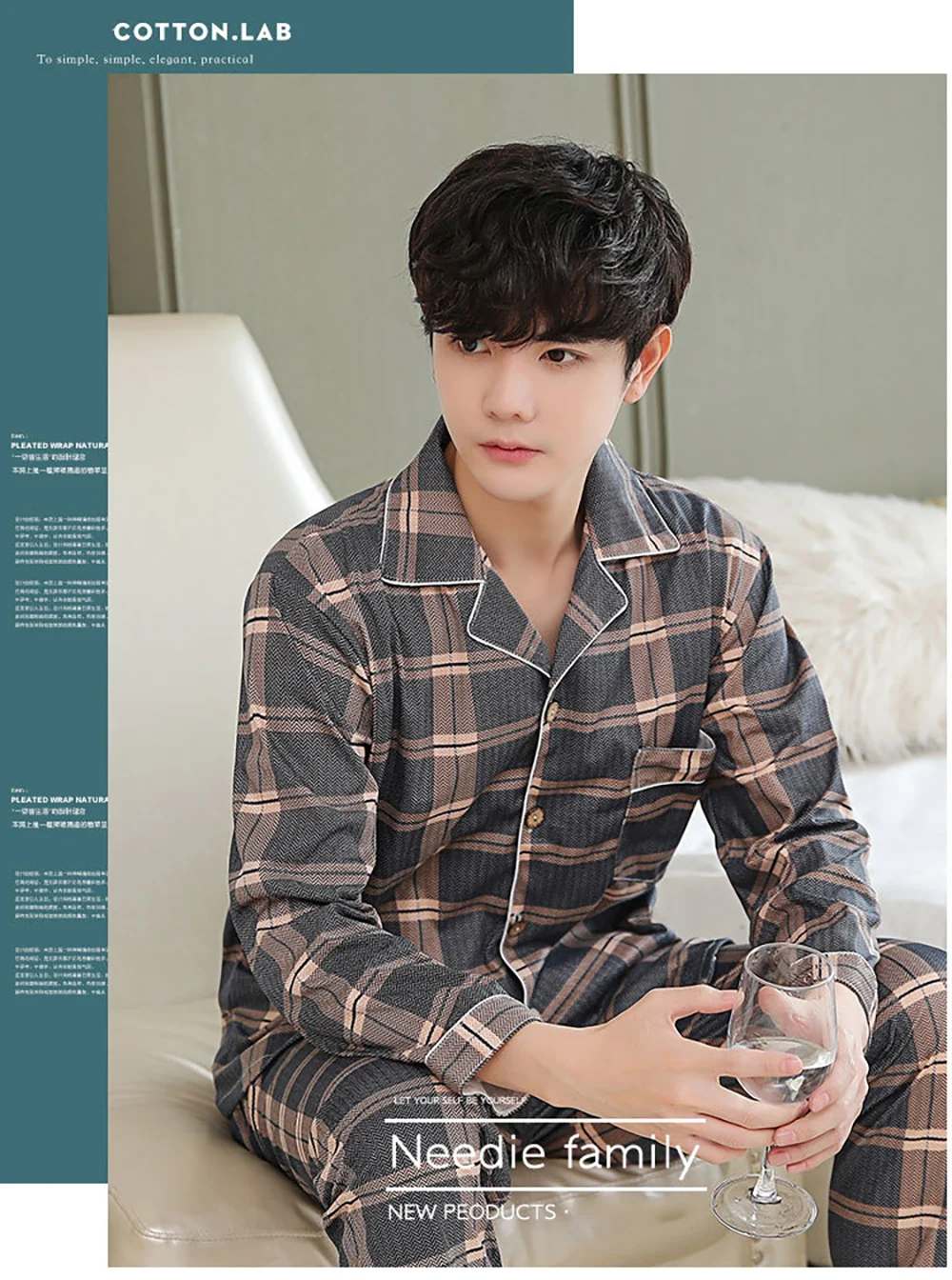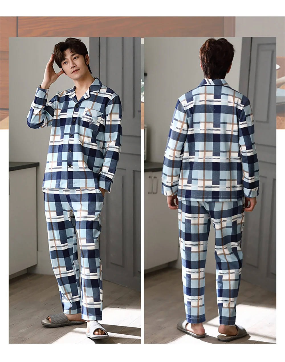 Весенне-осенние пижамные комплекты, Трикотажная хлопковая повседневная одежда для сна с длинными рукавами, клетчатая Домашняя одежда размера плюс, удобные пижамы для мужчин