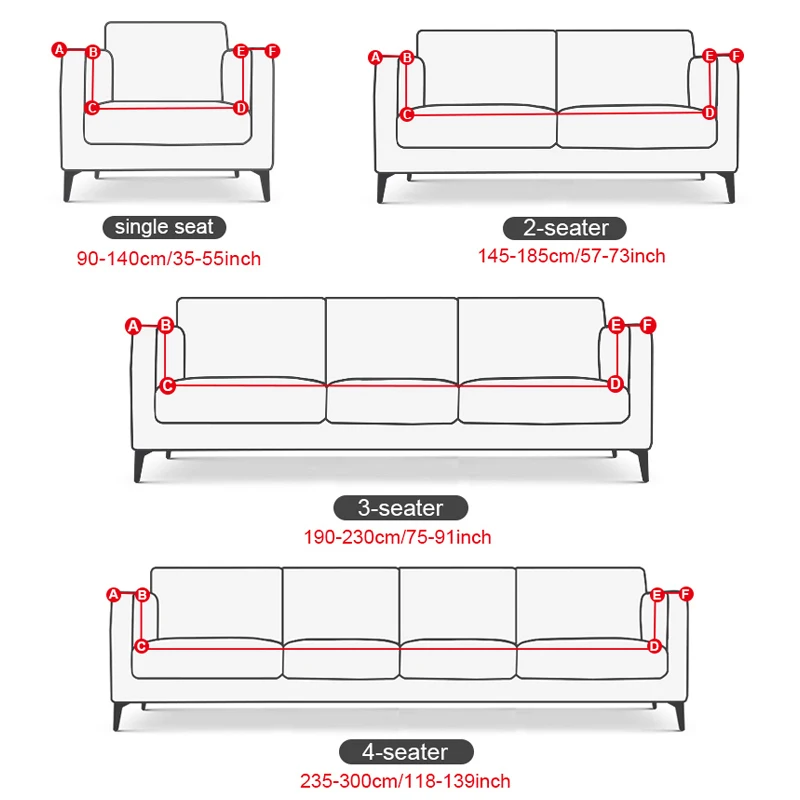 Одноместный чехол для дивана: подходит для дивана90-140 см/35,43-55,12 дюймаЧехол для дивана с двойным сидением: подходит для размера дивана145-185 см/57,09-72,83 дюймаЧехол для дивана с тремя сиденьями: подходит для размера дивана190-230 см/74,80-90,55 дюймаЧехол для дивана на четыре сиденья: подходит для дивана235-300 см/92,52-118,11 дюйма