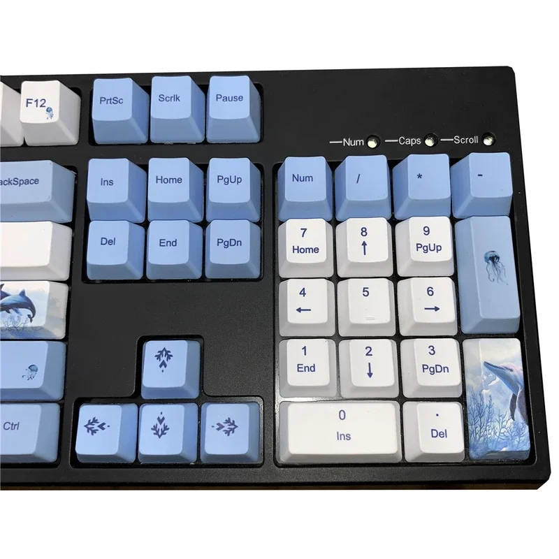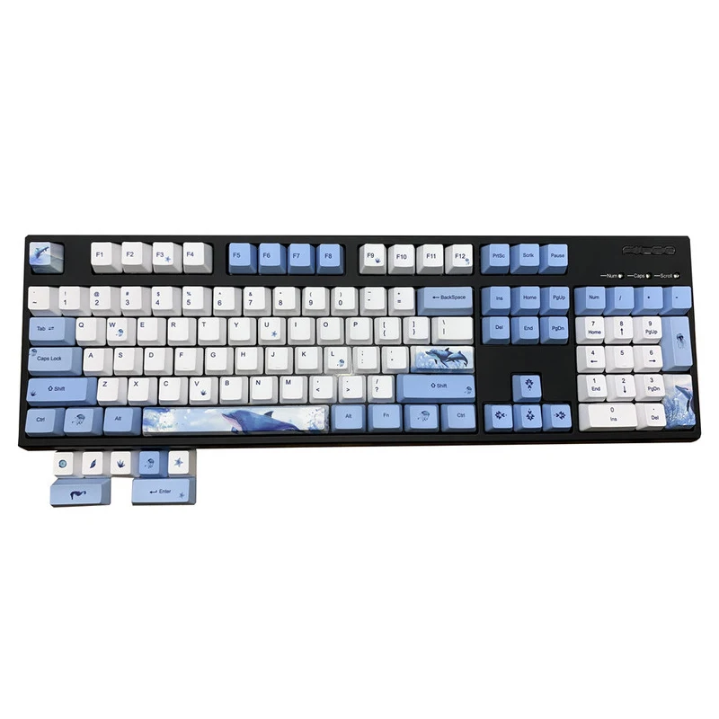 Эта ссылка представляет собой целый набор ключей с голубым Китом, включающий 104 + 7 ключей с сублимационной краской. Они подходят для большинства макетов клавиатуры в мире, включая мини-клавиатуру и полноразмерную клавиатуру.