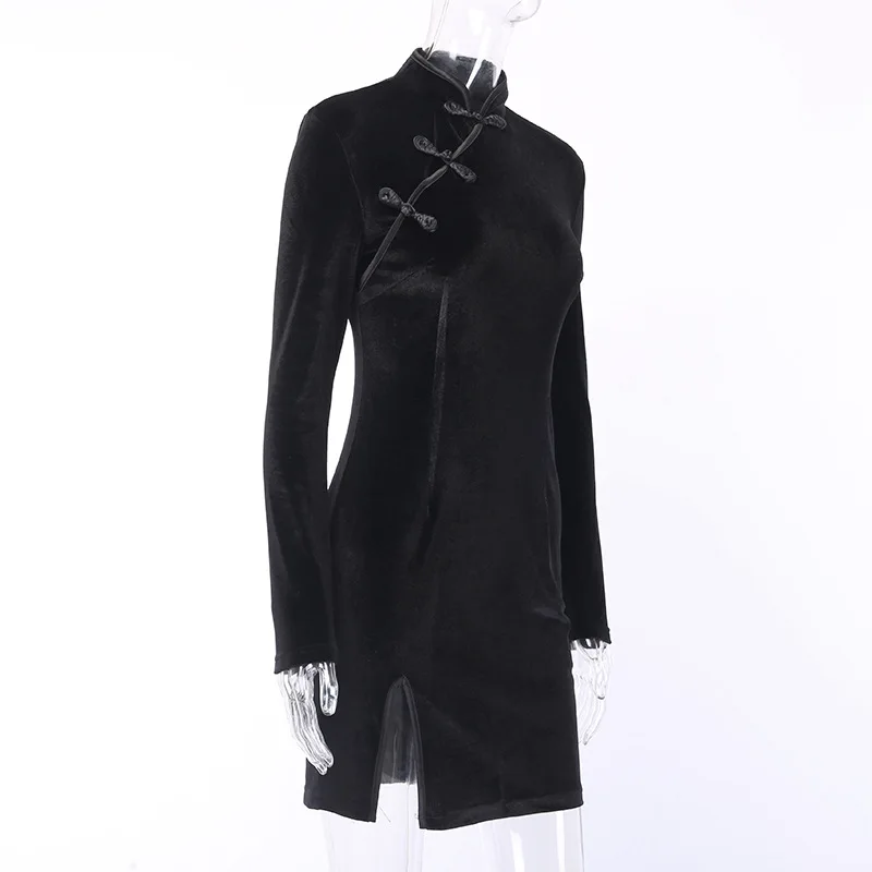 Винтажное облегающее платье в китайском стиле, женское черное бархатное Мини-Платье С Боковым Разрезом, готическое элегантное строгое платье