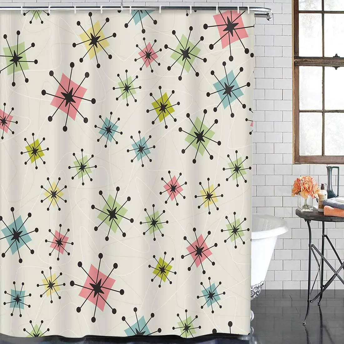 Занавеска для душа EDOMGNIH, винтажная занавеска для душа с узором в виде атомных звезд, в стиле ретро, средней центрии, набор из водонепроницаемой полиэфирной ткани с крючком