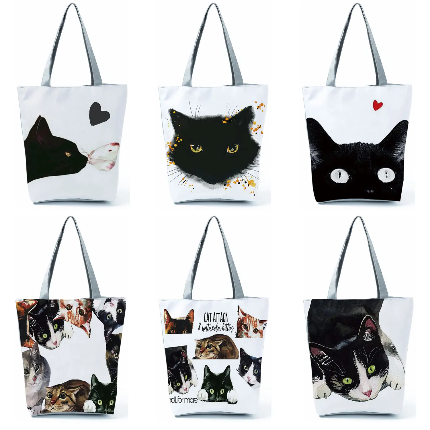 Индивидуальные милые акварельные женские дизайнерские сумки-тоут с рисунком кота, многоразовые сумки для покупок, школьные сумки для хранения