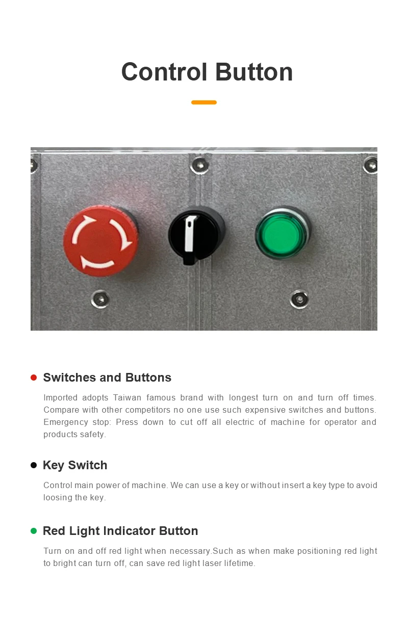 Переключатели и кнопки: импортированные из Тайваня известные бренды с самым длинным временем включения и выключения. По сравнению с другими конкурентами никто не использует такие дорогие переключатели и кнопки. Аварийная остановка: нажмите вниз, чтобы отрезать все электрические машины для безопасности оператора и продуктов. Клавишный переключатель: Управление основной мощностью машины. Мы можем использовать ключ или без вставки типа ключа, чтобы избежать потери ключа. Красный светильник Кнопка индикатора: включить и выключить красный светильник при необходимости. Например, когда вы делаете позиционирование красный светильник яркий может выключить, может сохранить красный светильник срок службы лазера.