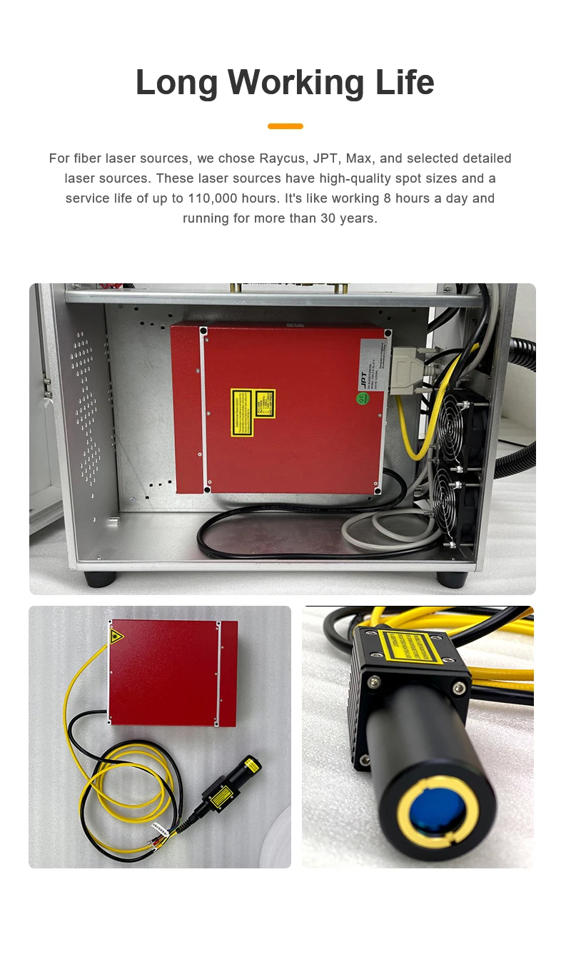 Волоконный лазерный источник мы выбираем Raycus, JPT, Max с детализацией выбранного лазерного источника с высоким качеством размера пятна и длительным сроком службы более 110000 часов работы. 8 часов в рабочий день работает более 30 лет.